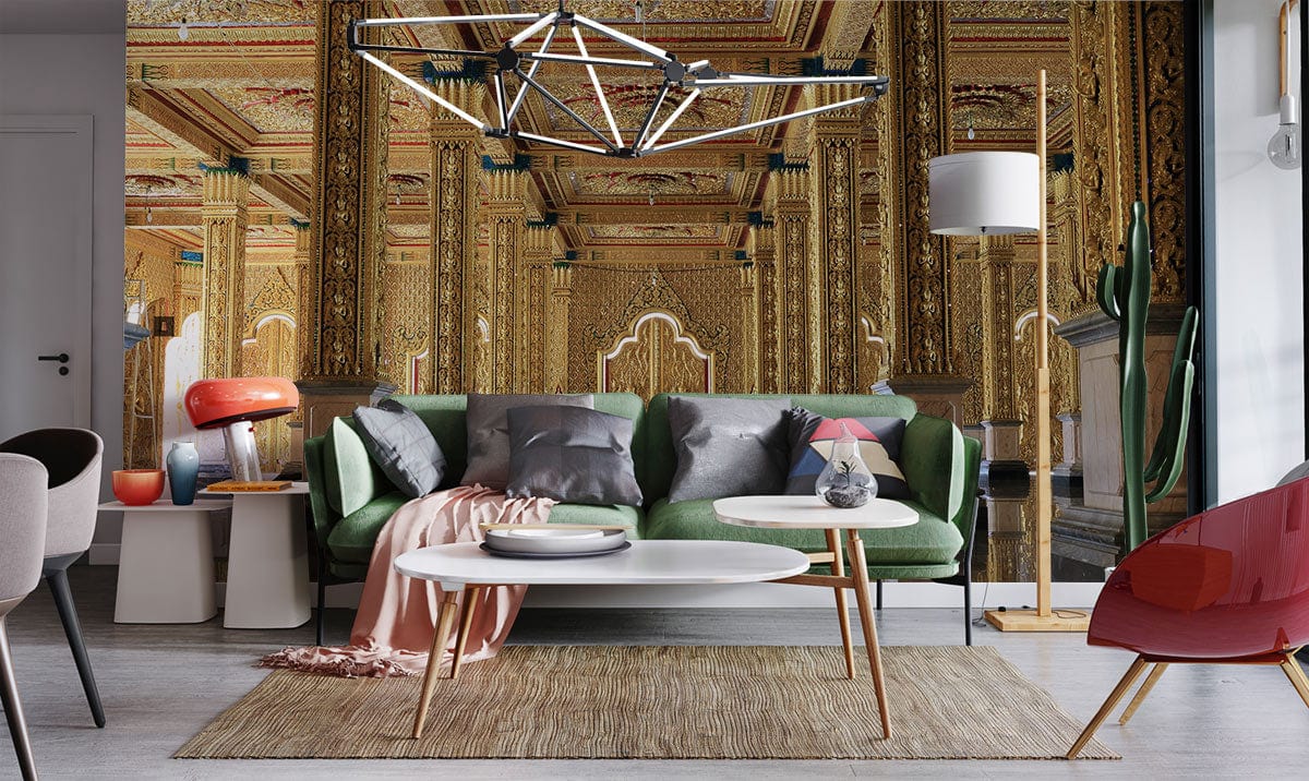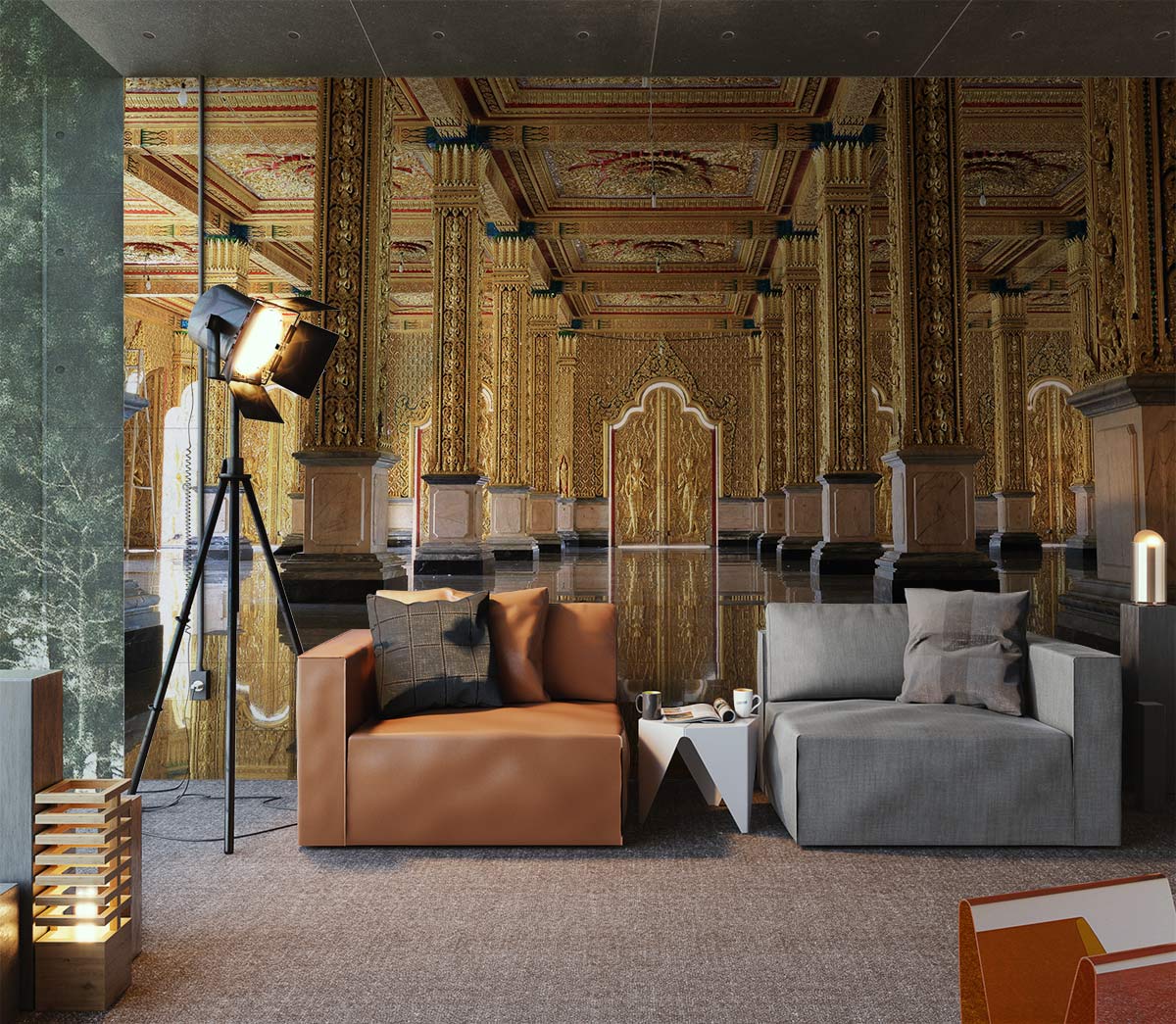 Ce papier peint panoramique de palais en 3D est magnifique. La décoration du palais est glorieuse et délicate. Elle peut agrandir visuellement l'espace de votre pièce. Et elle peut améliorer l'atmosphère de votre pièce. Le design de cette peinture murale est accrocheur et époustouflant. Elle peut être installée dans votre chambre, votre salle de bains, votre salon et votre bureau à domicile. Et vous serez alors placé dans un magnifique palais.