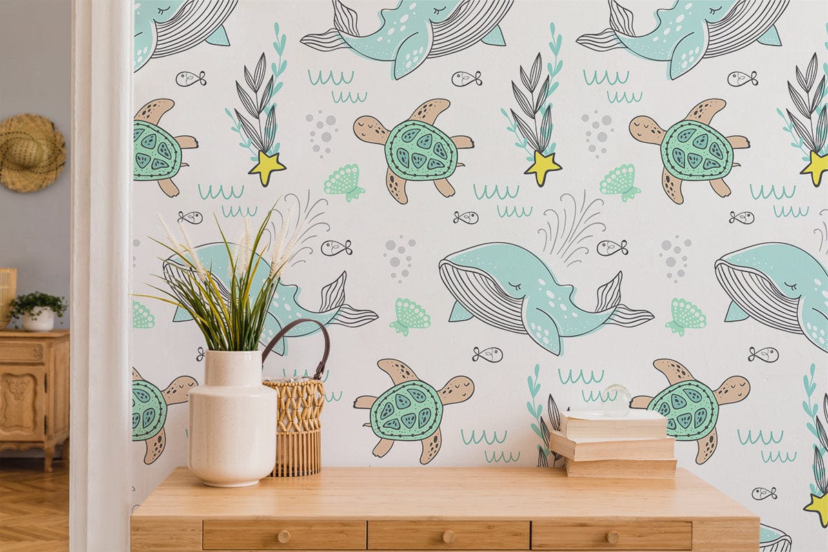 Un enfant heureux... une maison heureuse. Faites en sorte que votre enfant adore son petit monde à la maison avec cet adorable papier peint mural qui donnera à sa chambre un nouveau degré de douceur. Les nuances légères de bleu avec le blanc bleuâtre brumeux à l'arrière-plan font que les baleines et les poissons jouant autour de ces tortues sont si beaux et charmants. Le design est si léger et fera paraître la pièce plus large et plus lumineuse. Utilisez des décorations légères et des meubles et rideaux en bois blanc pour un effet plus fluide dans la pièce.