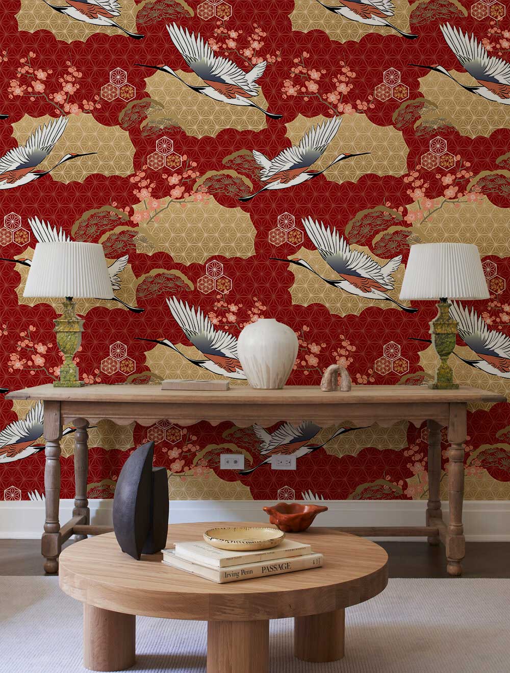 Accueillez une vibration subtile et belle dans votre espace. Vous pouvez choisir ce papier peint mural, la grue japonaise. Ce papier peint panoramique est étonnamment délicat et fascinant. Sur le fond rouge, les belles grues déploient leurs ailes pour voler librement. Ce merveilleux papier peint mural peut être installé dans un restaurant, une salle à manger et un couloir. Vos invités resteront bouche bée devant son élégance.
