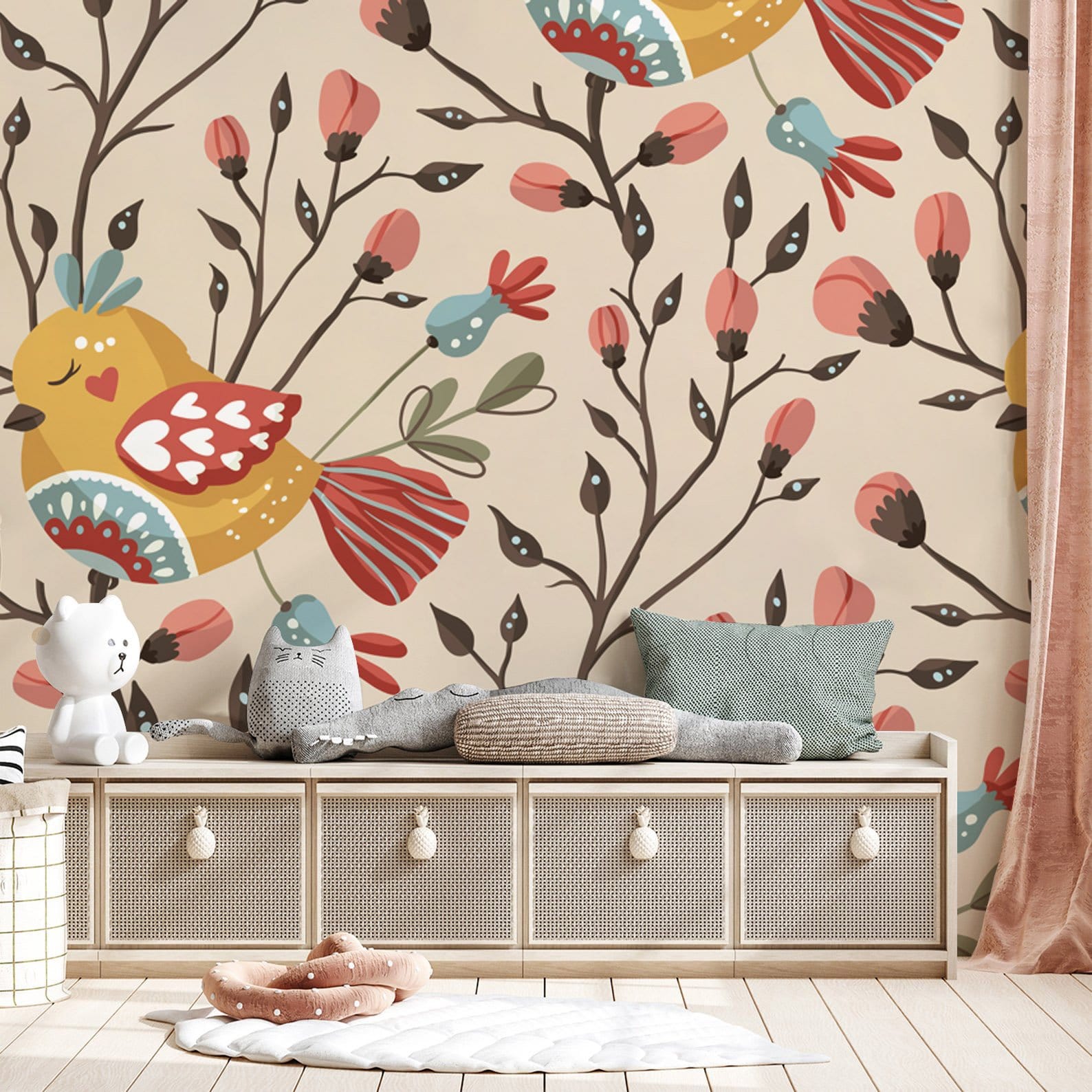 Ressentez ce moment de paix avec ce papier peint d'oiseaux endormis. Cette décoration murale est conçue avec des oiseaux mignons dormant sur les branches de fleurs sur fond de couleur pastel, ce qui apportera sûrement un look vintage mais frais à votre espace. Papier peint parfait qui fonctionne bien avec toute votre chambre, salon, cuisine et salle à manger.