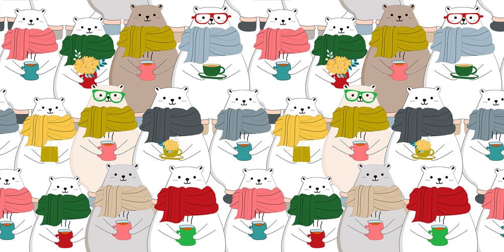 Faites un voyage dans la forêt avec ce papier peint mural Bears Wear Scarf. Ce mignon papier peint animalier représente un groupe d'ours portant tous des écharpes colorées, ce qui en fait un ajout parfait à la chambre de votre enfant ! Ce design ajoutera instantanément du charme et de la chaleur à n'importe quelle pièce tout en cachant les imperfections de vos murs. Ce papier peint pour enfants est un excellent cadeau pour l'anniversaire de votre enfant, un cadeau de Noël, une décoration de chambre d'enfant, et plus encore !