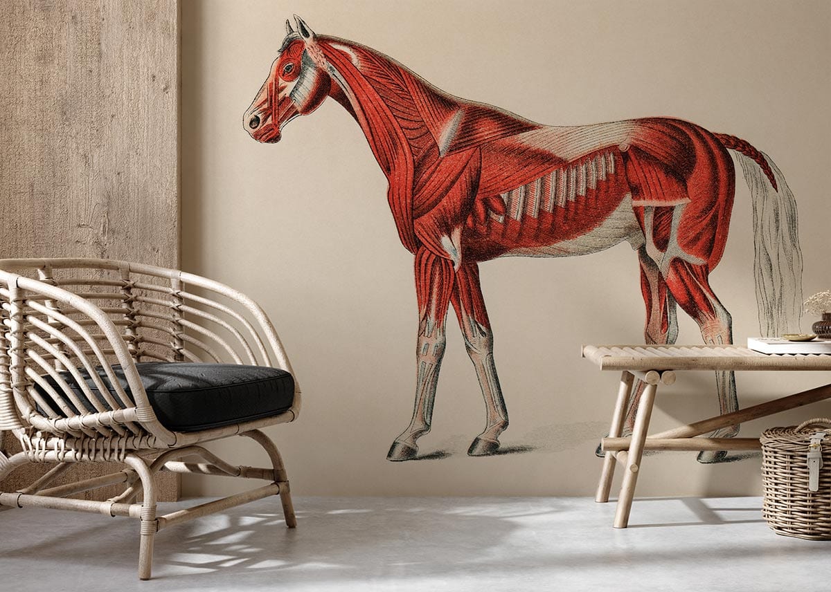 Qu'il s'agisse d'un décor magnifique ou d'un cadeau parfait pour les amoureux des chevaux, notre Papier peint panoramique Muscle de cheval peut vous offrir les deux. La combinaison de muscles, d'os et de squelette de cheval apportera du charme aux murs de votre chambre ou de votre salon. Le jeu de couleurs rouge et blanc est un mélange classique qui contribue à l'aspect ludique et à la créativité de cette peinture murale. Ce papier peint sur le thème des animaux est le choix parfait pour tous ceux qui aiment les chevaux et qui veulent décorer leur maison avec ce design cool.