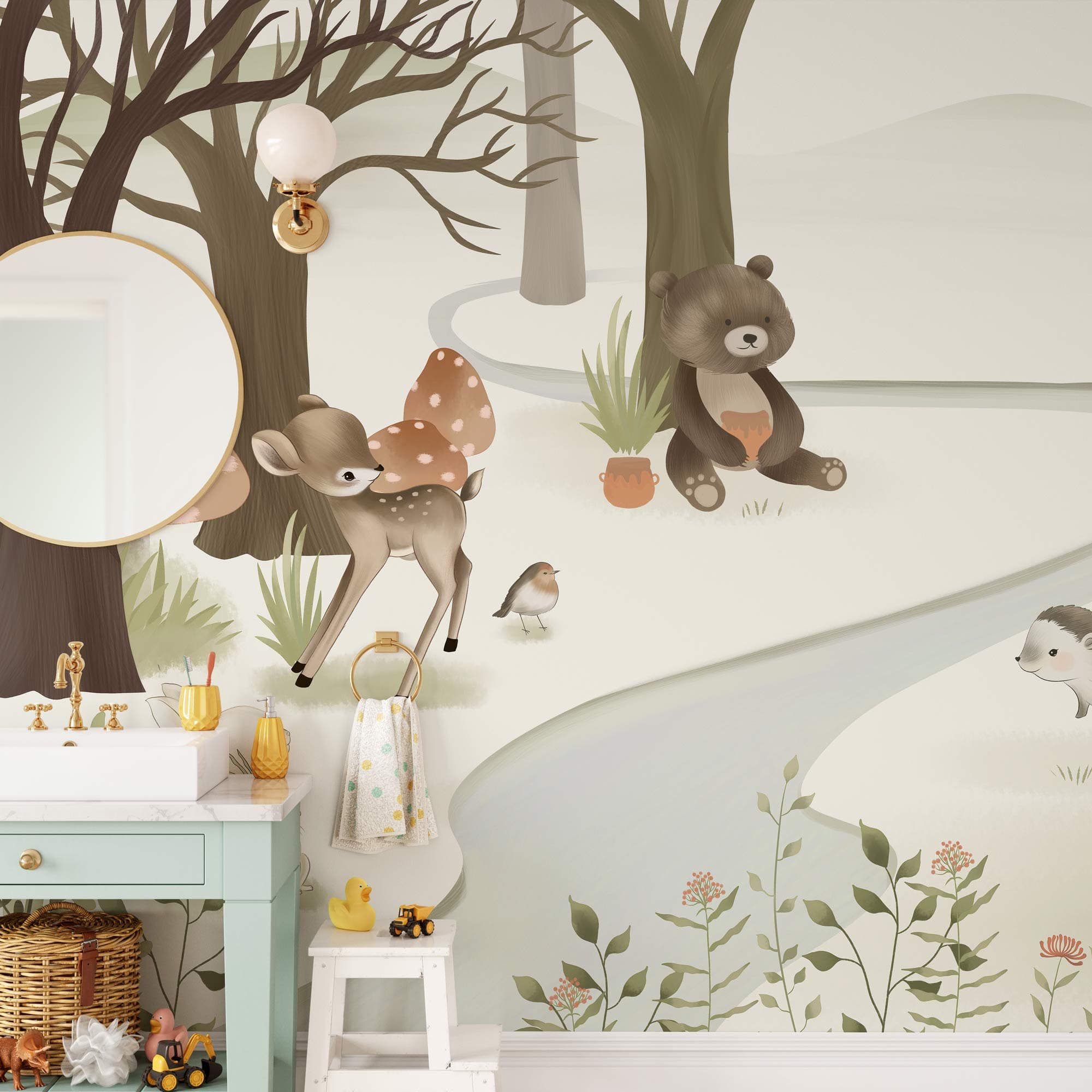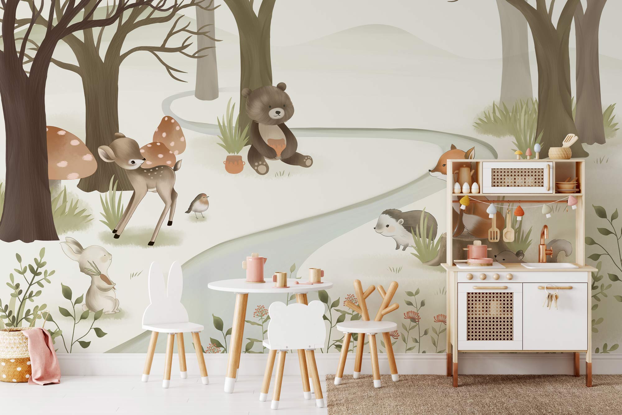 Apportez facilement un thème d'animaux forestiers à couper le souffle à la chambre ou une pépinière d'un enfant avec notre papier peint de la faune de la faune aquarelle, plein de belles créatures forestières et de couleurs naturelles. Cette murale est un design peint à la main mettant en vedette certains des adorables animaux trouvés dans les forêts, telles que l'ours, le cerf et le renard. Les petits seront étonnés par cette scène faunique comme mur de caractéristiques dans leur chambre. Faites ressortir le côté curieux de vos enfants avec une conception murale remplie de nature qu'ils chériront pendant qu'ils grandissent.