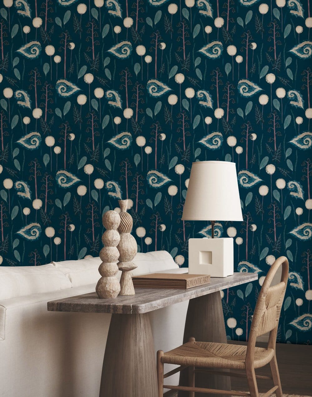 N'aimeriez-vous pas cette belle fleur bleue; Papier peint à feuilles mural décorant vos murs? Les feuilles et les fleurs pastel animées confèrent une aura agréable aux intérieurs sur le fond bleu foncé. Pourquoi ne pas l'utiliser dans votre chambre, votre salon ou votre salle à manger pour ajouter plus de fraîcheur et de joie.