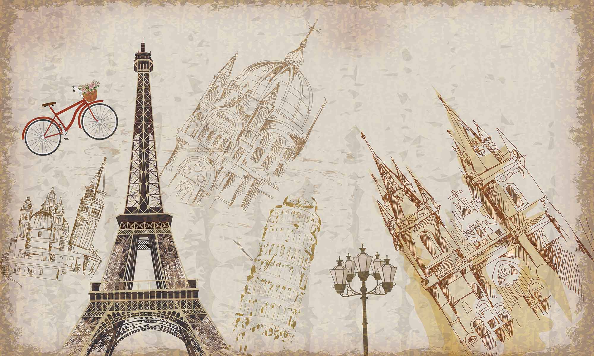 Vous voulez voyager à travers le monde et visiter des villes et des lieux célèbres ? Ayez ces célèbres papiers peints emblématiques dans votre maison! Il comprend la serviette Eiffel, la cathédrale Notre-Dame, la serviette penchée de Pise, etc. peintes dans un style vintage. Rendez votre intérieur unique et époustouflant avec cette fresque murale emblématique !