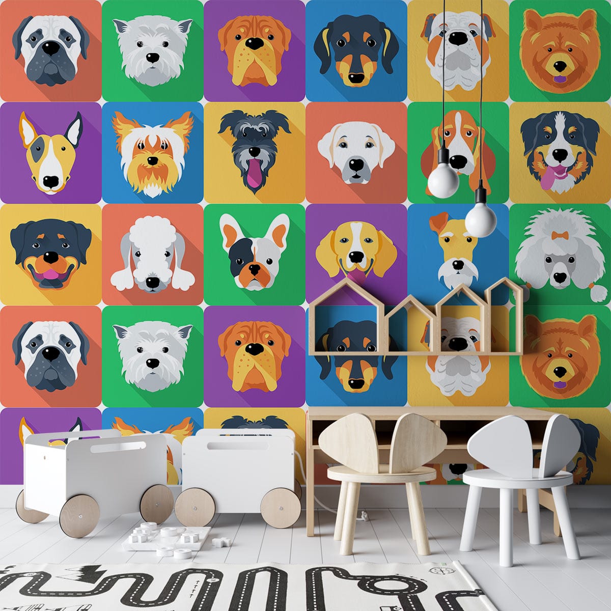 Égayez votre chambre d'enfant avec un design de papier peint mural très moderne et coloré pour carton chiens qui les rendront si enthousiastes à propos de leur lieu. Le design est si lumineux et si heureux. Si vos enfants aiment les chiots et les animaux domestiques, offrez-leur cette décoration et laissez-les profiter du joli thème de leur chambre. La conception de cette peinture murale vous aidera à vous engager davantage avec eux en leur permettant d'apprendre les différentes races et types de chiens, vous pouvez également les laisser donner un nom à chaque chien et leur poser des questions sur leur préféré. Ce design est si coloré, alors essayez d'utiliser une décoration blanc cassé et des tapis et rideaux clairs pour un thème apaisant à la vue d'ensemble de la pièce.