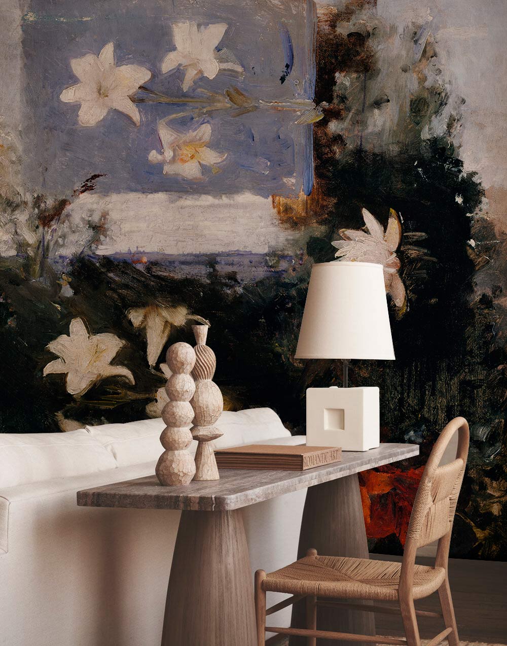 Ce papier peint mural de peinture de fleurs remplira votre maison de vie et fera parler vos murs de l'art. Cette peinture à l'huile avec le ciel bleu en arrière-plan et les fleurs blanches suspendues dans les feuilles, rendra votre lieu si vivant et vibrant. Associez ce papier peint mural à la beauté naturelle à un mobilier classique pour un style classique très classe dans des décorations en bois doré à votre réception, votre salon ou votre chambre. Vous pouvez également l'associer à un mobilier moderne et à des rideaux en mousseline blanche. Dans les deux cas, il sera extrêmement chic et absolument élégant.