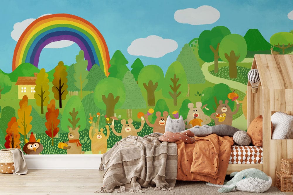 Papier peint mural amusant et fantaisiste, le papier peint mural Forest Rainbow Feast présente un motif d'animaux originaires de la forêt. D'adorables renards, ours et lapins, ainsi que d'autres créatures des bois, se retrouvent dans ce motif, de même que des chenilles de tente et des buissons de baies. Cette peinture murale offre une perspective amusante sur le concept, avec une palette fraîche et un design ludique qui apporte de la joie à tout espace. Elle présente une scène de forêt aux couleurs de l'arc-en-ciel et des animaux enjoués pour les enfants de tous âges. Transformez donc l'apparence d'une pièce avec des motifs et des dessins d'ambiance qui vont au-delà des surfaces planes, donnant aux murs une dimension supplémentaire et un intérêt visuel.