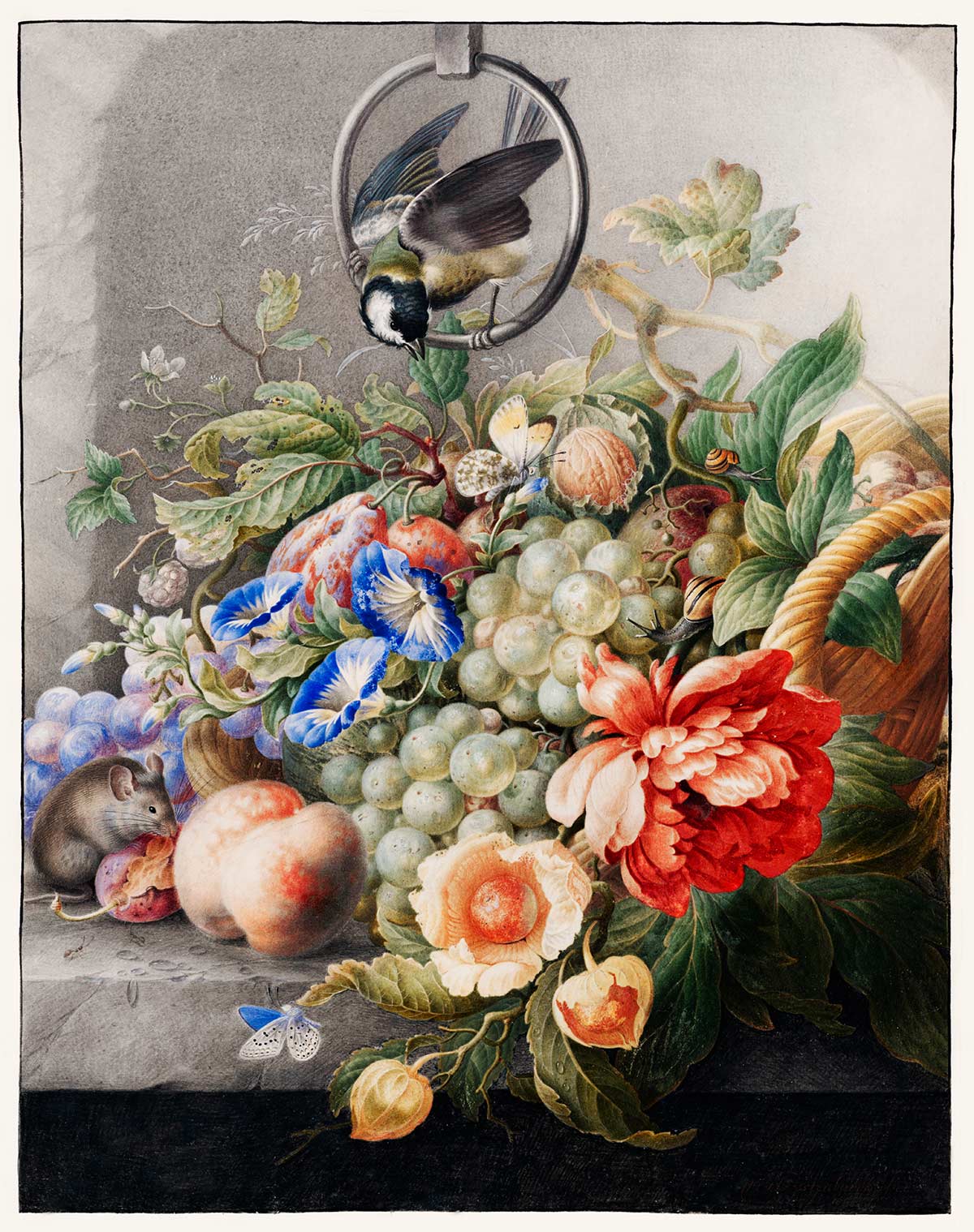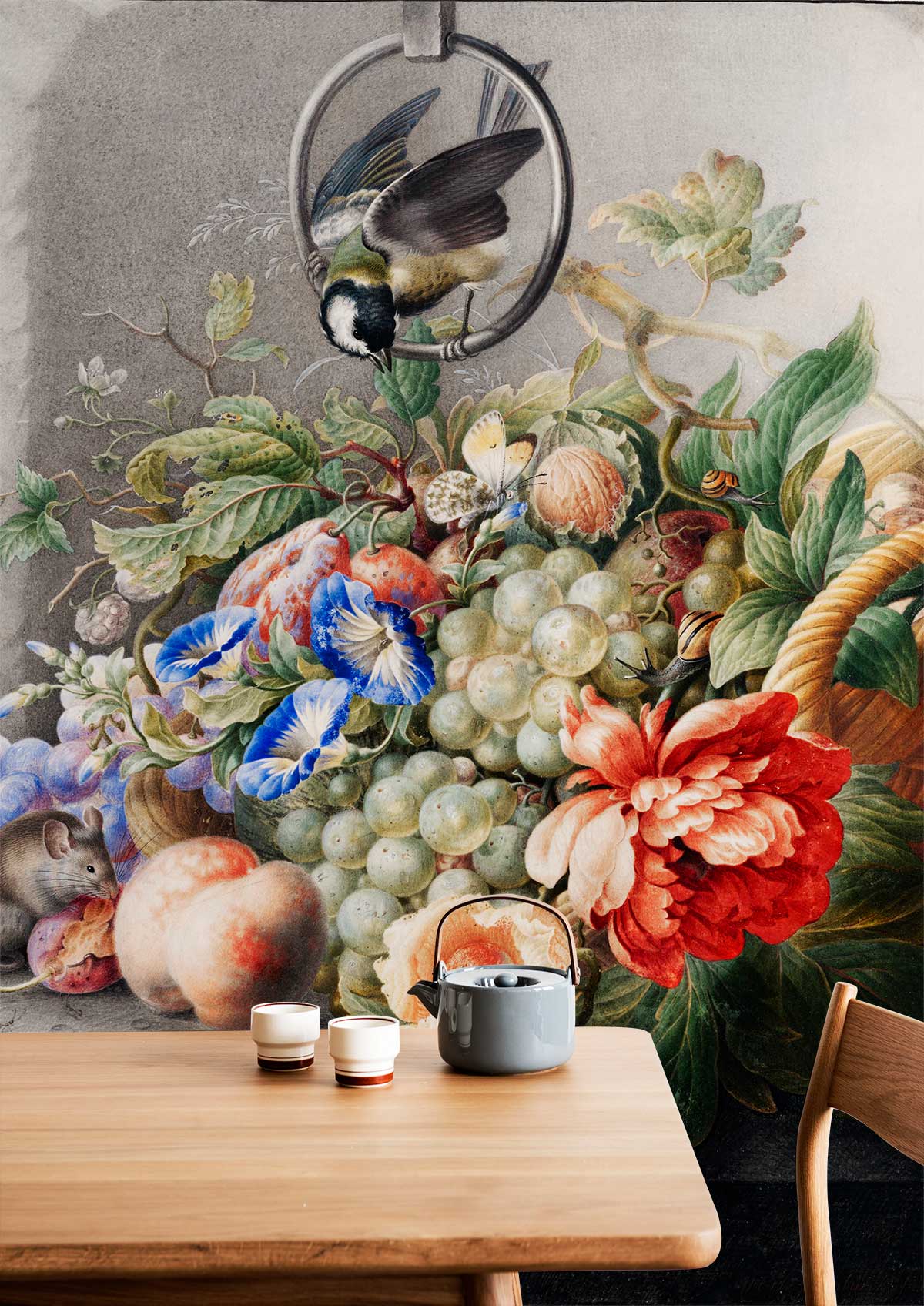 Appréciez la beauté de l'art avec cette assiette de fruits mélangés en papier peint mural avec la touche d'art victorien. Les fleurs embrassant les différentes sortes de fruits et les aquarelles de la peinture vous font sentir le luxe du design. Ce papier peint coloré avec l'harmonie entre les éléments est le mélange parfait pour donner un nouveau goût à votre maison. Sentez l'intégrité avec le rat qui tient un fruit pour manger et satisfaire ses besoins et la nature qui l'entoure avec les raisins et les différentes fleurs. Ce papier peint est parfait si vous voulez une salle à manger différente et chic, ou un design de cuisine, ou aussi un salon avec un goût très spécial. Complétez le look avec des décorations simples pour le rendre plus accrocheur et plus attrayant.