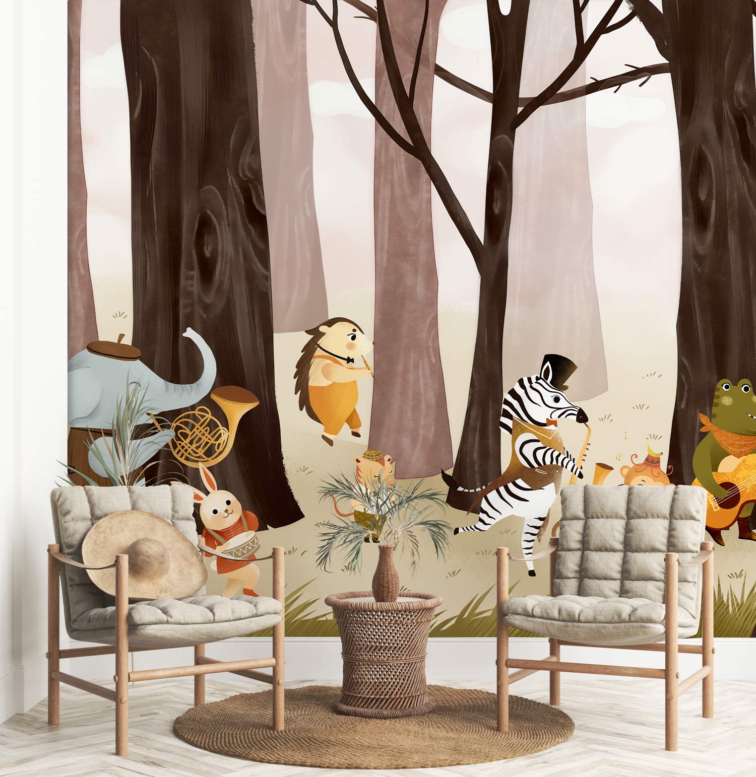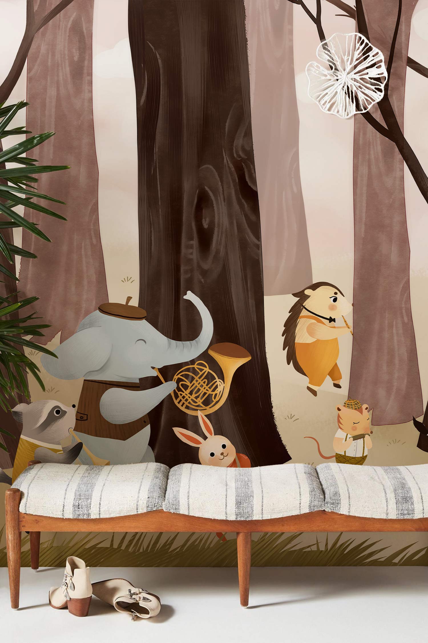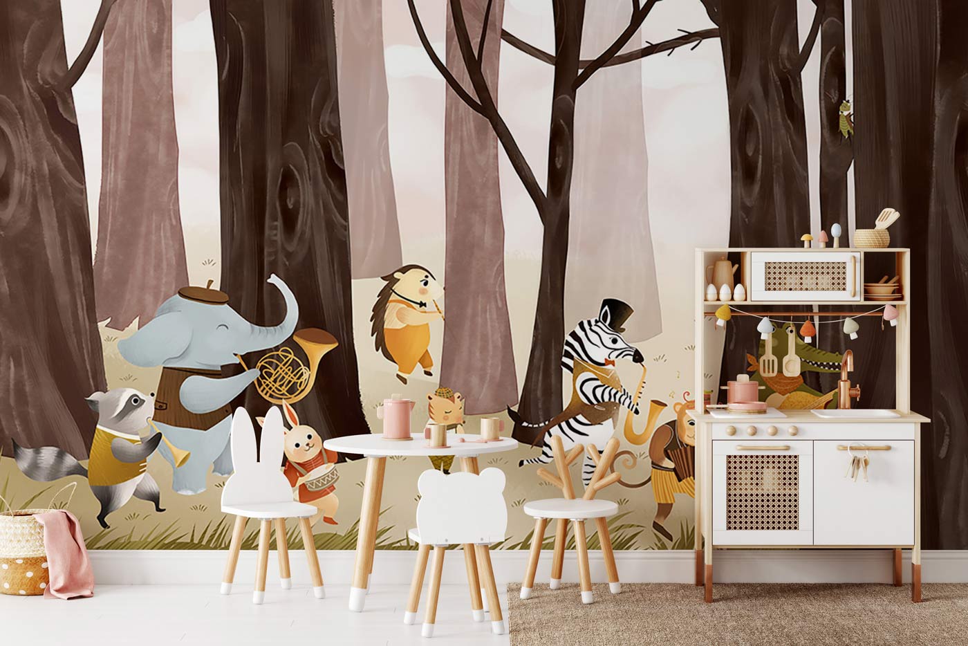 Profitez d'un merveilleux concert de musique dans votre maison avec cette murale de papier peint. Doté d'un groupe d'animaux mignon tenant un concert dans la forêt, cette adorable peinture attrayante est la création de cœur et sera parfaite pour la chambre et la salle de jeux de votre enfant. Rendu intéressant avec une atmosphère naturelle et une décoration murale rafraîchissante parfaite pour vos enfants.