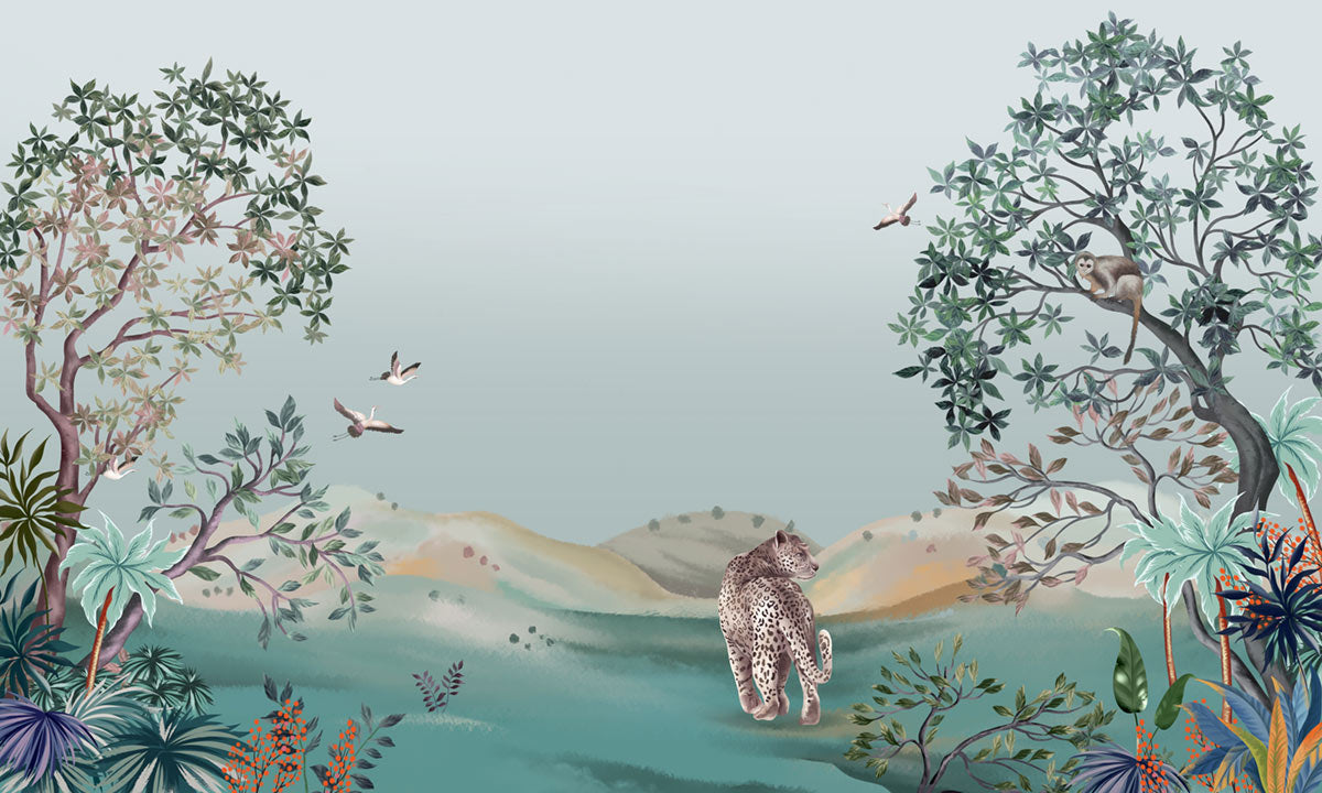 Si vous êtes à la recherche d'un papier peint mural représentant la jungle, ce motif sera un bon choix pour vous. Collines ondulées, arbres bourgeonnants et animaux vigoureux, cette peinture murale vous transportera dans un monde de jungle. Un léopard se promène en toute liberté sur cette image. Vous pouvez installer ce motif dans votre chambre, votre bureau à domicile et votre salon, et laisser vos invités en admiration.