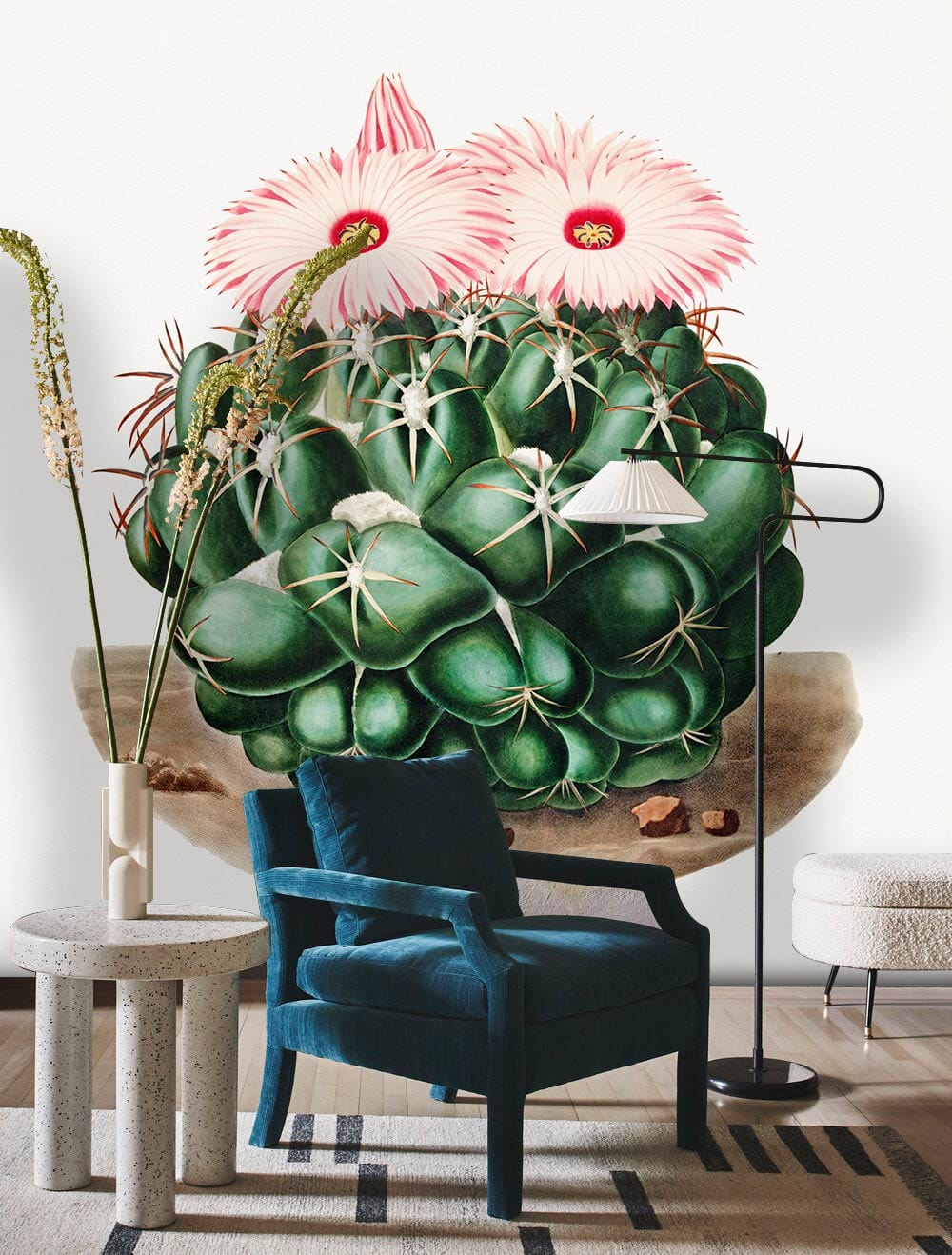 Pour ceux qui voient l'art dans la simplicité et la perfection dans le minimalisme. Ce papier peint mural est pour vous. Une pièce d'art dans un papier peint mural pour une plante de cactus à dents d'éléphant qui semble très unique et très spéciale. La peinture murale met l'accent sur le design qui attire votre attention sur cette beauté moderne. Les nuances rosées avec les verts foncés et les épines sur toute la plante sont un mélange de simplicité et de sauvagerie. Créez ce design là où vous voulez ajouter un thème unique, et donnez-lui un air chic et spécial. Dans votre salon, un tapis pelucheux rose et des canapés verts en velours donneront à l'endroit un aspect parfait !