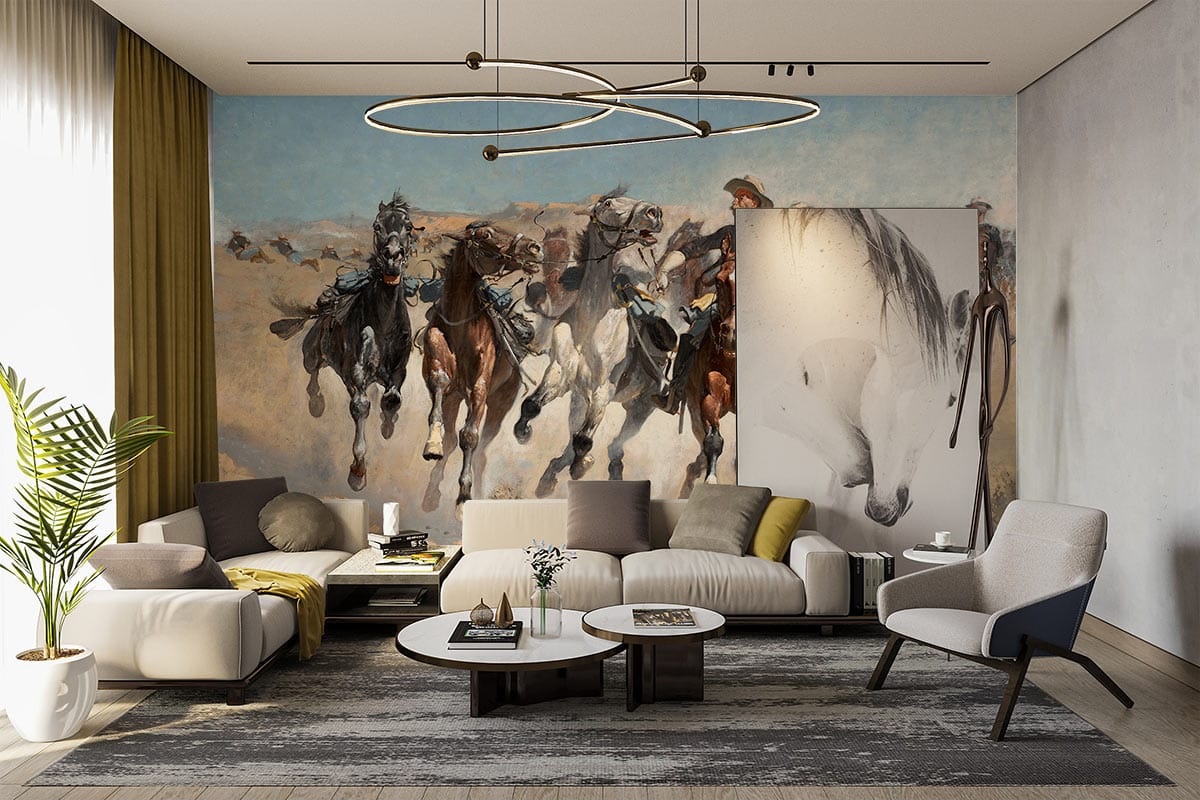 Le Fourth Troopers Moving the Led Horses a été conçu par Frederic Remington au 19ème siècle. Cette murale nous ramène aux temps turbulents de la guerre. Il montre l'élan des chevaux au galop et de la masculinité. Certains détails comme la poussière soufflée sont peints par des coups de pinceau. Cette illustration dessinée à la main présente une texture subtile et peut être adoptée dans le bureau d'un adulte ou la chambre d'un homme d'affaires.