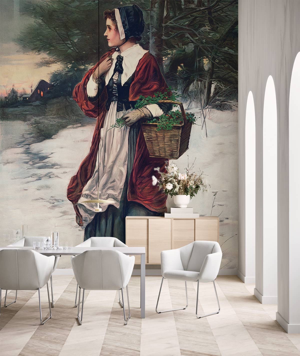 Prenez un moment pour contempler ce magnifique papier peint mural de peinture classique pour une dame cherchant son amour au matin de Noël. Ce design artistique classique est parfait si vous êtes de ceux qui aiment l'authenticité et le luxe. Le design est très classe et donnera l'effet du style de décoration des palais. Donc, si vous cherchez un style chic pour votre maison. Ce papier peint pour jeune femme devrait figurer en tête de votre liste. Donnez-lui un style à votre réception avec des meubles classiques, de lourds rideaux beiges et des canapés dorés. Ou à l'entrée de votre entreprise pour attirer l'attention de tous vos invités et impressionner tout le monde avec votre goût en matière de décoration.