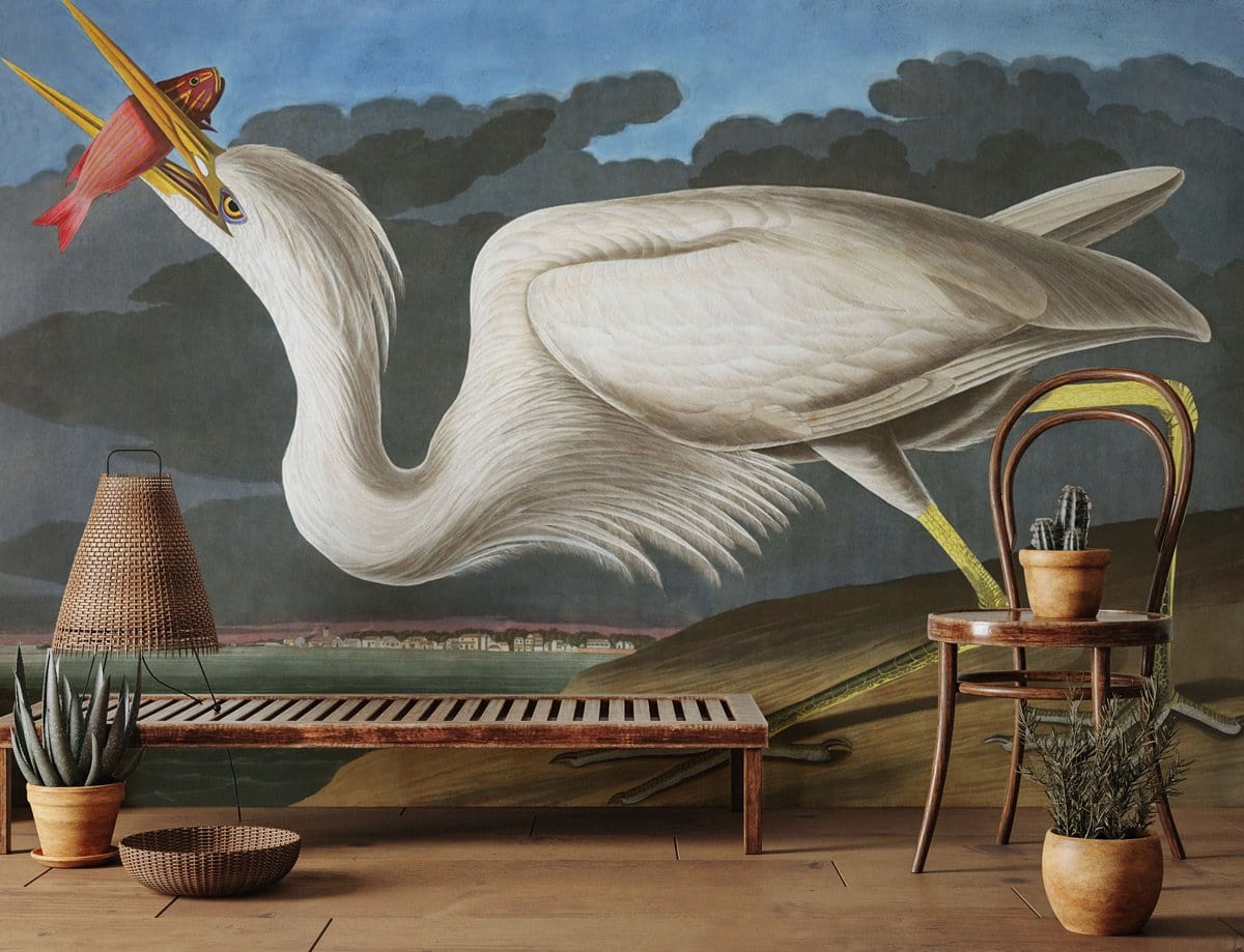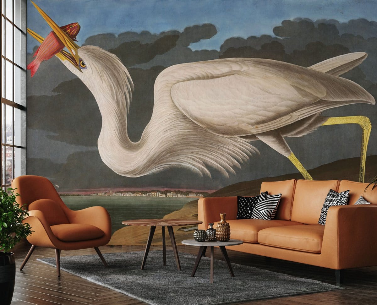 Cette murale de papier peint de héron blanc est une décoration idéale à utiliser comme arrière-plan. Cette belle et incroyable peinture d'un grand héron qui attrapait du poisson au bord du lac sera parfaite pour les intérieurs de votre maison. Rendu intéressant avec une atmosphère naturelle et une décoration murale rafraîchissante parfaite pour n'importe quel jour et nom affable: créatures avec des scènes vertes.