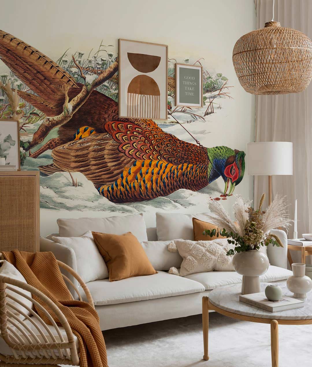 Ce Faisan de Colchide montre la vue sauvage avec de la neige blanche et des plantes flétries avec vivacité. Nous pouvons facilement prêter attention au motif de cette peinture murale. Nous sommes curieux de savoir ce qui s'est passé et voulons découvrir et rechercher. La peinture murale est principalement composée de blanc et de marron mais affiche une vue magnifique à travers une peinture fantastique. Le point le plus élogieux est ce sang parce qu'il est comme la perle de la couronne. N'êtes-vous pas tombé amoureux de ce papier peint délicat ?