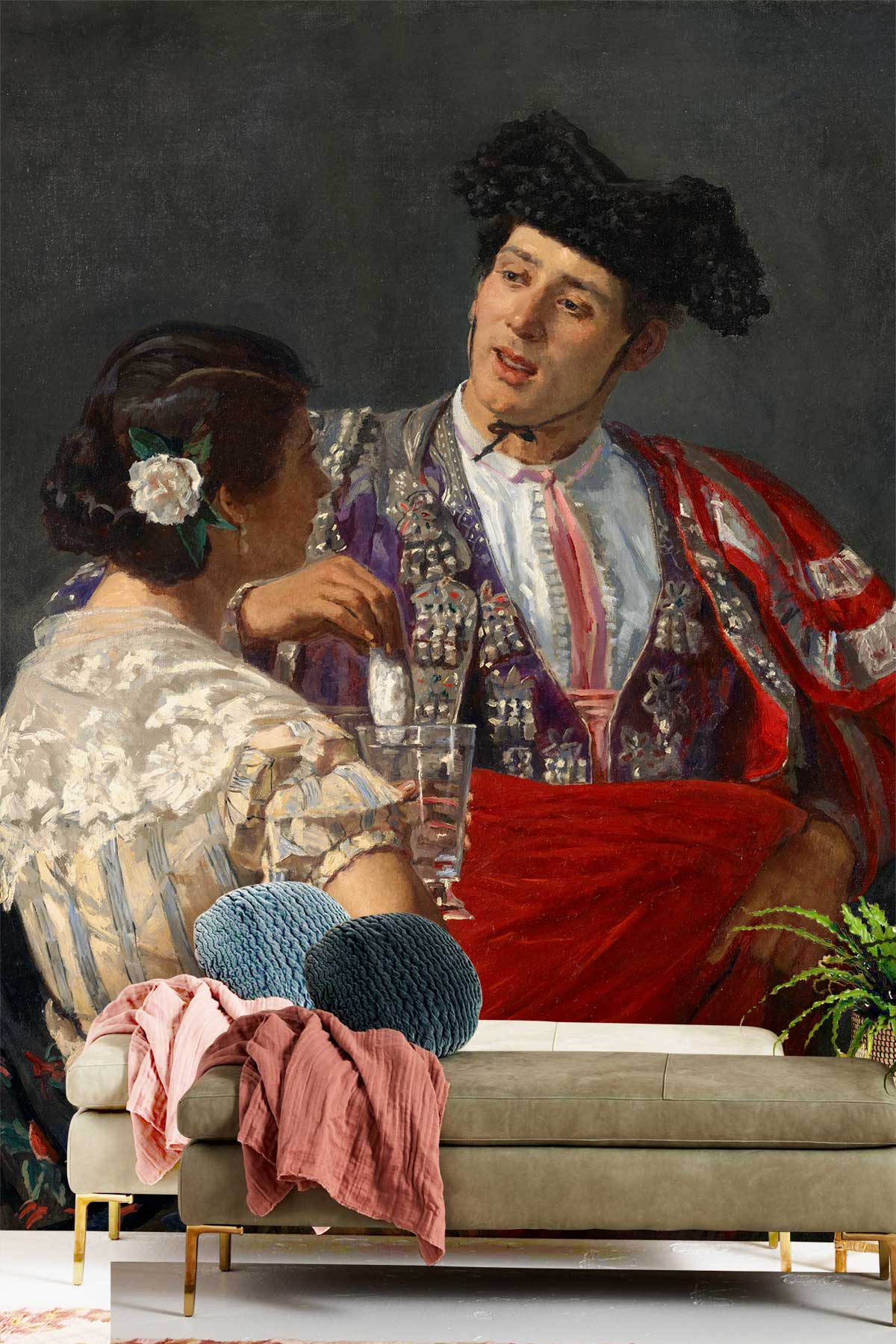 Prenez un moment pour contempler l'amour qui se dégage du regard de ce torero pour la jeune femme dans ce papier peint panoramique. Le papier peint montre une conversation intime et silencieuse entre eux et ils semblent profondément amoureux. La peinture a des nuances de couleurs vraiment merveilleuses pour ajouter de l'aristocratie et un nouveau goût noble à votre intérieur. Associez ce papier peint à un mobilier classique dans votre chambre, votre bureau, votre salon ou dans le hall principal de votre palais avec des tapis classiques et des rideaux épais.