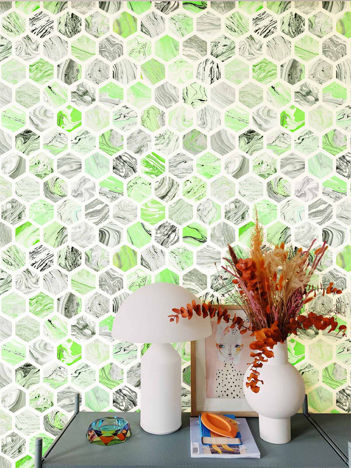 papier peint hexagonal vert mural