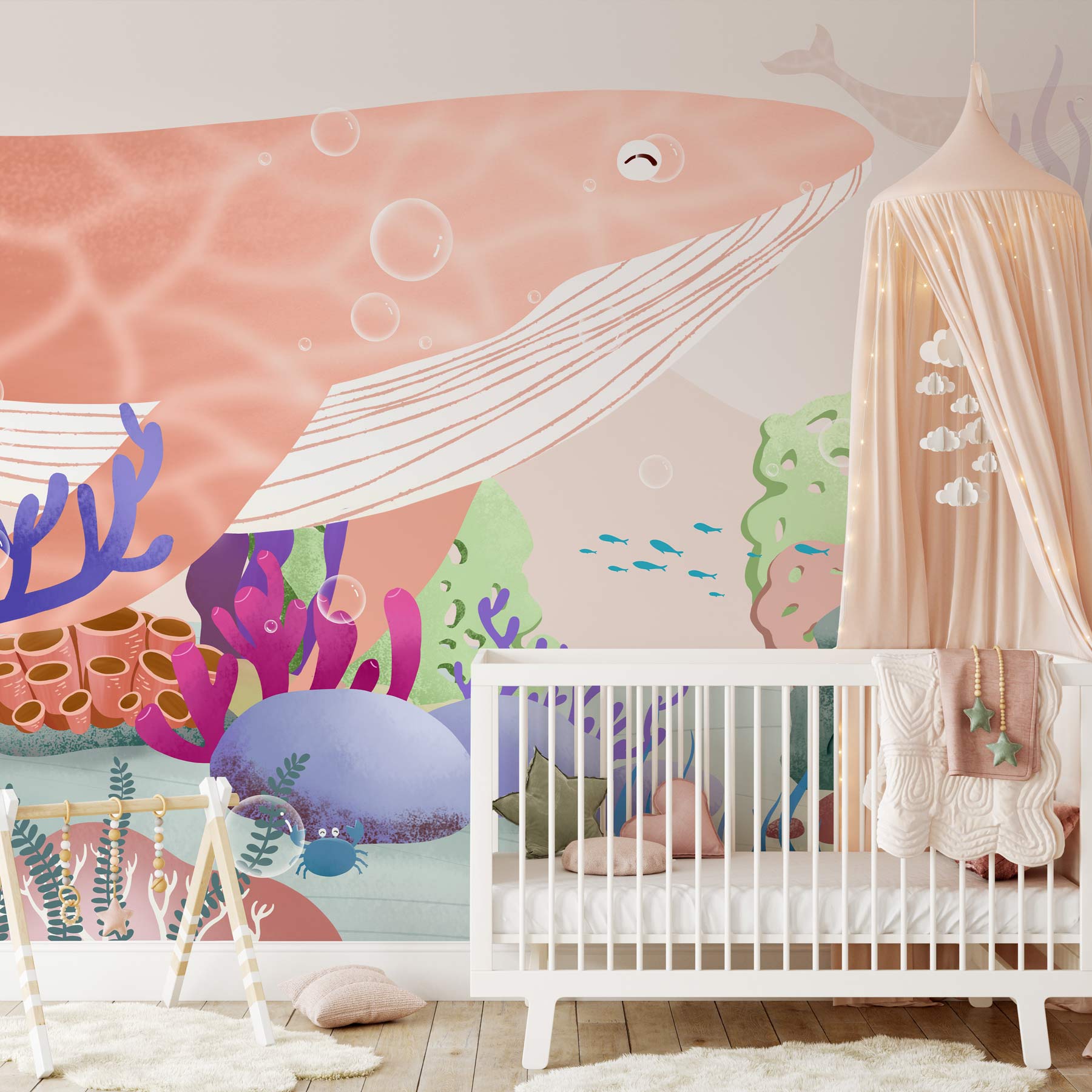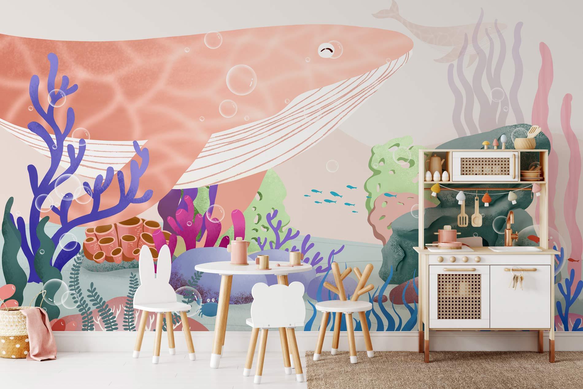 Explorez le monde incroyable sous la mer avec cette peinture murale. Vos enfants vont adorer! Cette murale de papier peint avec une belle scène de créatures d'animaux de mer dessinées à la main telles que les baleines roses et les coraux colorés, réorganisera sûrement votre espace! Grand fond d'écran pour la chambre et la salle de jeux pour enfants.