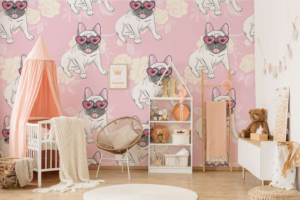 répandre l'amour et la modernité chez vous sans charmant français Bulldog Ever Wallpaper mural. Le Pinky Couleur au niveau de la Le fond le rend si girly et si mignon de concevoir votre chambre si vous aimez les animaux de compagnie et les chiens. Si vous avez un bouledogue, ce design sera préfet et rendra votre chien si énergique. Ce design est si brillant et simple et génial pour ceux qui veulent de beaux designs mignons et à la mode qui rendent la pièce si relaxante et belle. Utilisez ce design avec des meubles et des décorations blancs et vous pouvez utiliser des tapis et des rideaux gris clair pour plus de contraste de couleurs.