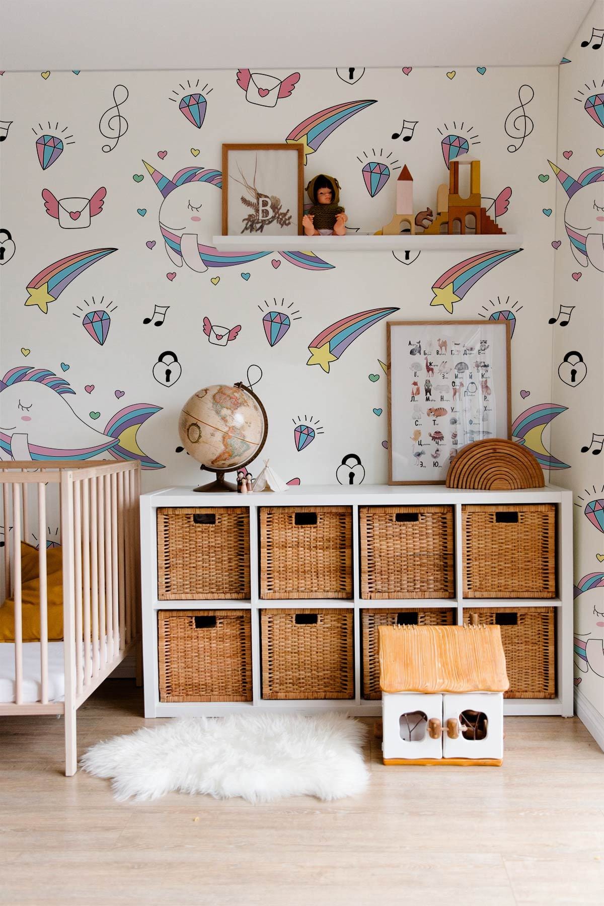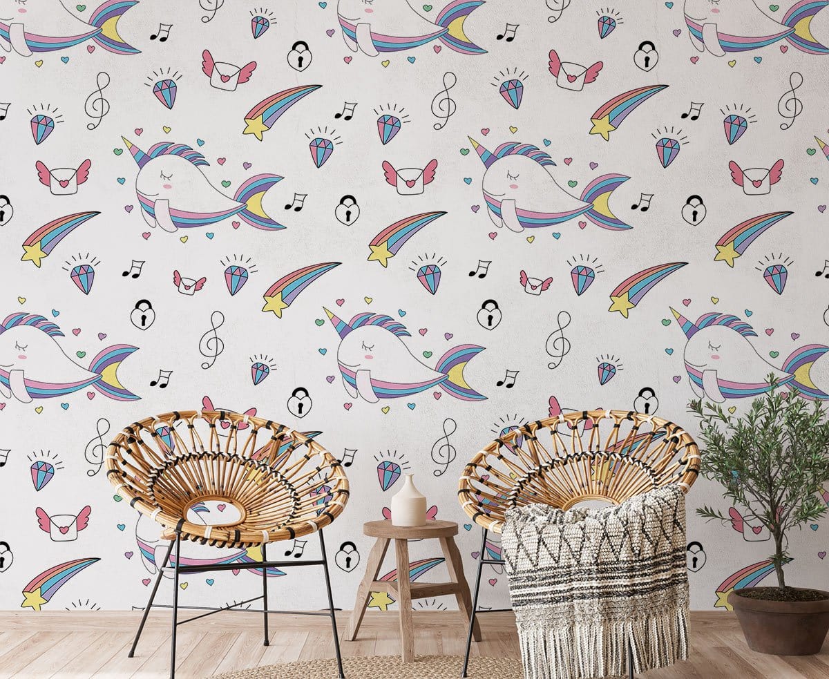 Apportez une belle ambiance à votre espace avec ce papier peint mural de licorne de dessin animé. Conçu avec des motifs répétés de dauphins rêveurs, d'étoiles et d'autres imprimés de dessins animés sur fond blanc, vos tout-petits tomberont immédiatement amoureux de cette décoration murale. Utilisez-le comme mur caractéristique dans la chambre des enfants, la salle de jeux et; chambre de bébé et associez-la à des meubles de couleur blanche ou pastel de votre choix.