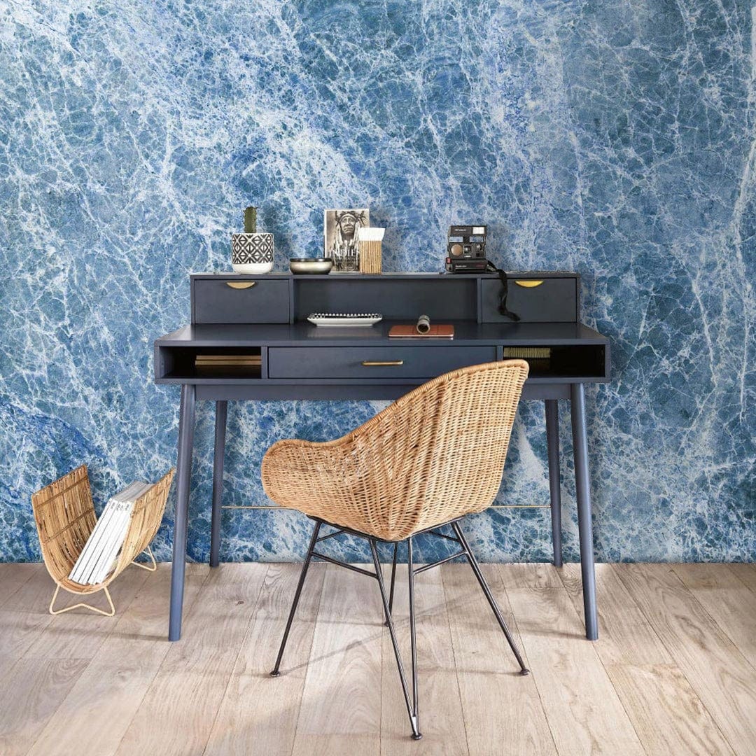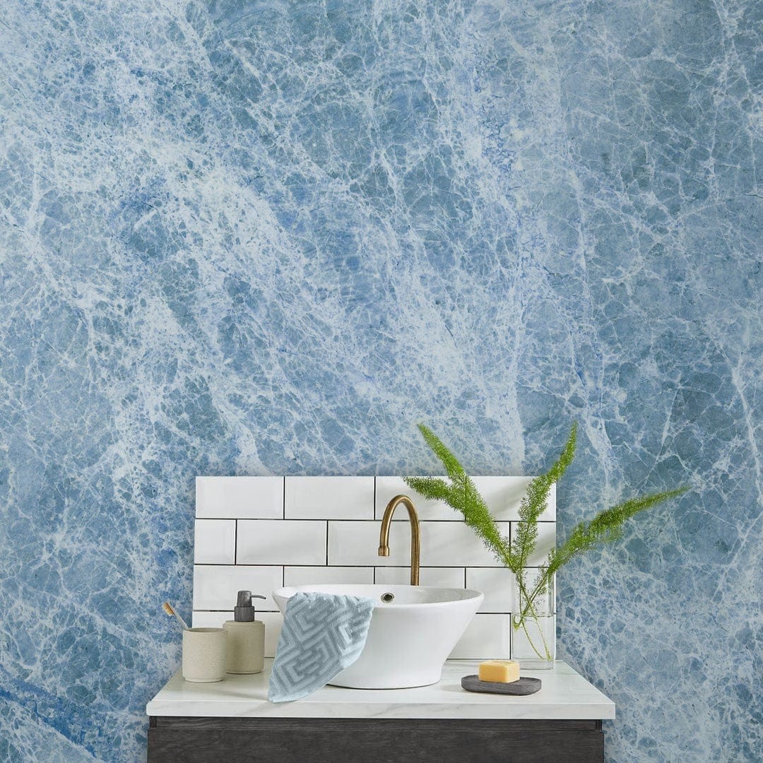La pierre de couleur bleue est taillée avec de petites fissures pour créer une dalle de marbre calacatta visuellement époustouflante. Élégante et confiante, cette murale capture la variété et la complexité de la pierre naturelle. Papier peint mural disponible en papier peint amovible à peler et coller et en papier peint permanent. Imprimé avec des encres sans danger pour les enfants.