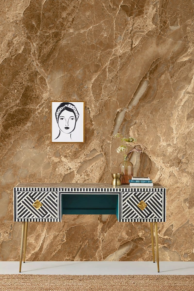 La pierre de couleur marron est taillée avec de petites fissures pour créer une dalle de marbre calacatta visuellement époustouflante. Élégante et confiante, cette murale capture la variété et la complexité de la pierre naturelle. Papier peint mural disponible en papier peint amovible à peler et coller et en papier peint permanent. Imprimé avec des encres sans danger pour les enfants.