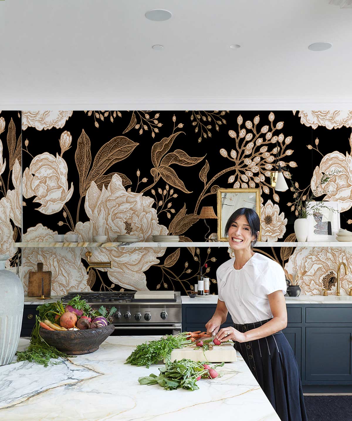 Le papier peint mural Elegant Floral constitue un arrière-plan sophistiqué et élégant pour votre maison, votre bureau ou votre entreprise. Ce délicat papier peint floral est parfait pour créer un espace romantique, ce qui le rend idéal pour les chambres d'adultes et les chambres d'amis. Les motifs riches et classiques de fleurs dorées et blanches sur un fond noir rafraîchissent un style moderne et chic, de sorte qu'il peut se démarquer dans le quartier. Le motif floral est intemporel mais toujours aussi moderne. Il se marie parfaitement avec presque tous les styles et couleurs de design, ce qui le rend polyvalent à souhait.