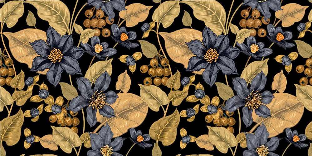 Ajoutez instantanément du style et de la beauté à vos murs avec ce magnifique papier peint mural fleuri. Le design chic et élégant présente des fleurs fruitées classiques bleues et dorées sur un fond noir profond. C'est l'ajout parfait pour toute pièce de votre maison qui a besoin d'un petit quelque chose en plus. Qu'il s'agisse d'une salle d'eau ou d'une suite parentale, vous pouvez certainement apporter une retraite tranquille et chaleureuse à votre espace avec ce papier peint mural à fleurs Fruitage.