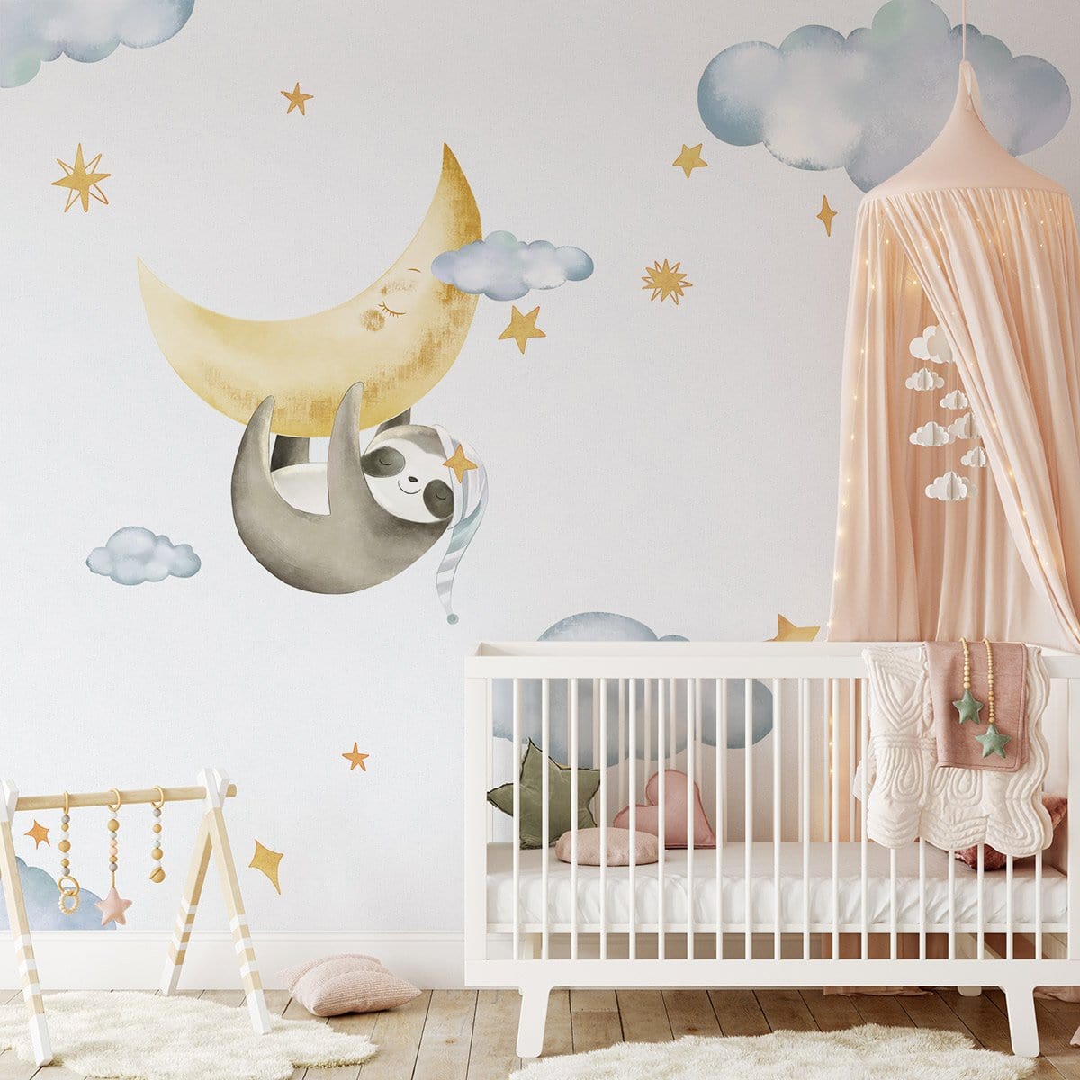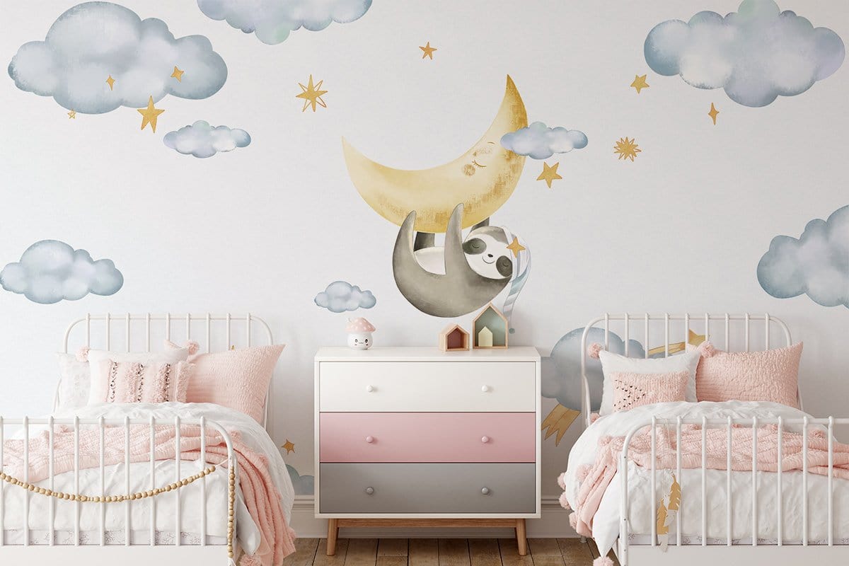 Jetez un œil à cet adorable papier peint avec un paresseux sur la lune dans une soirée étoilée de rêve, n'est-ce pas merveilleux! Peint avec des tons de rêve doux qui seront parfaits pour la chambre et la pépinière de vos enfants. Placez ce fond d'écran sur le mur qui est à côté de leur lit et profitez du sentiment paisible qu'il vous apporte, vous et vos enfants.