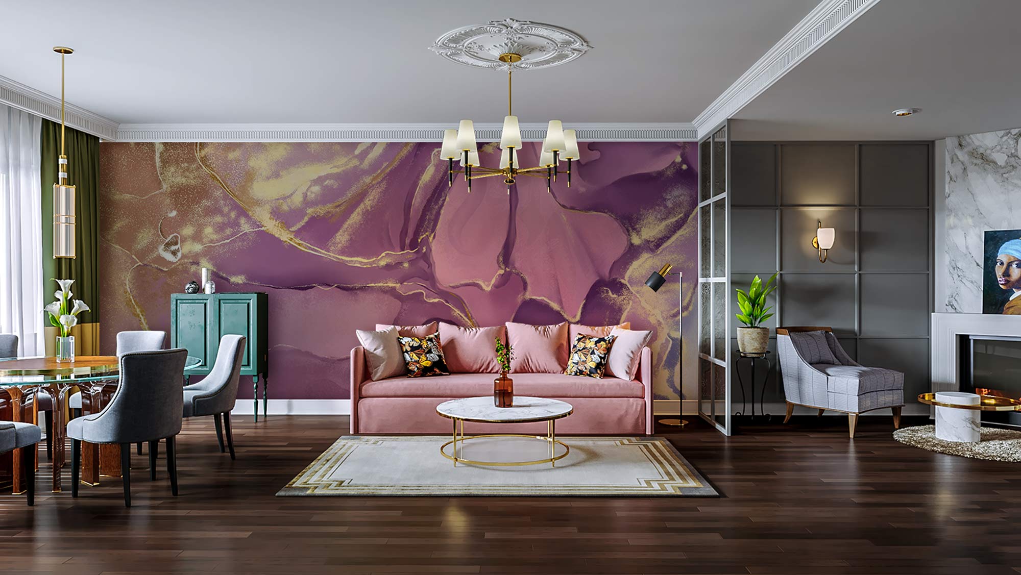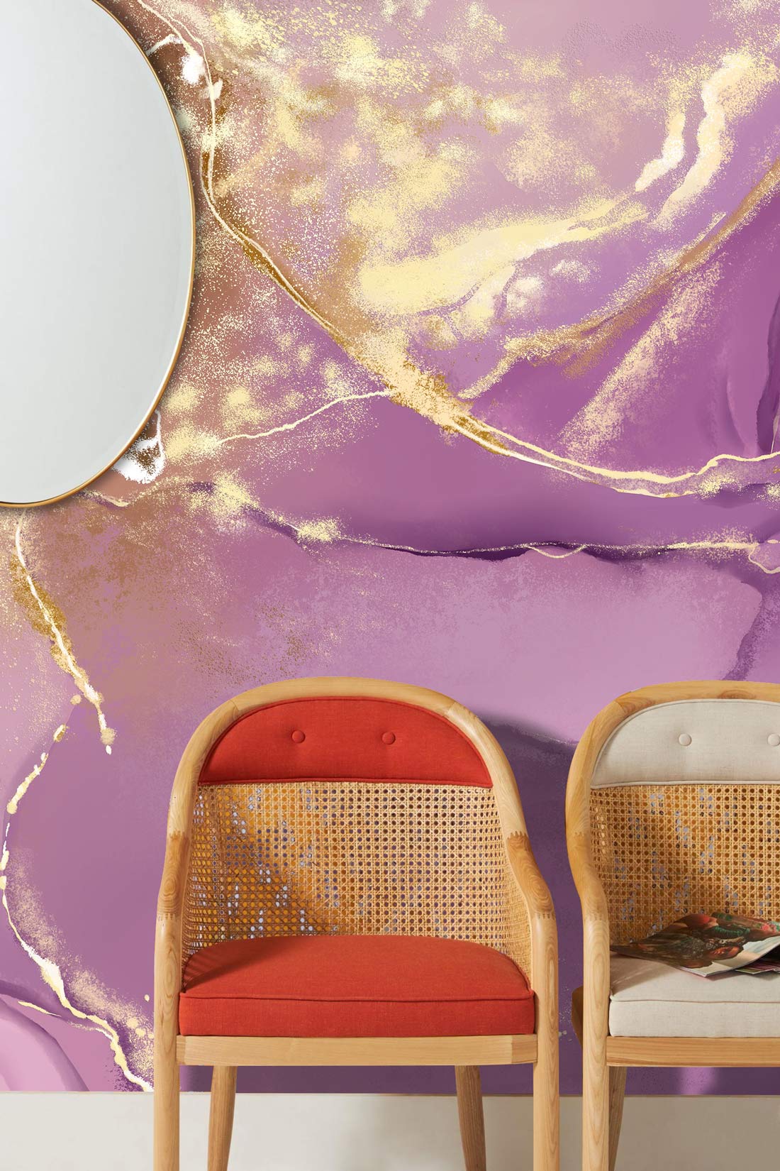 Cette murale de papier peint à effet de marbre violet est améliorée par des lignes d'or de ses fissures et veines. Le magnifique marbre de couleur violette est décoré de lignes en métal dorées, qui augmenteront votre mur ordinaire et toute l'atmosphère de votre espace. Il fonctionnera brillamment dans votre salle de bain, votre salon et votre couloir. Utilisez ce fond d'écran pour créer un moment wow pour votre maison.