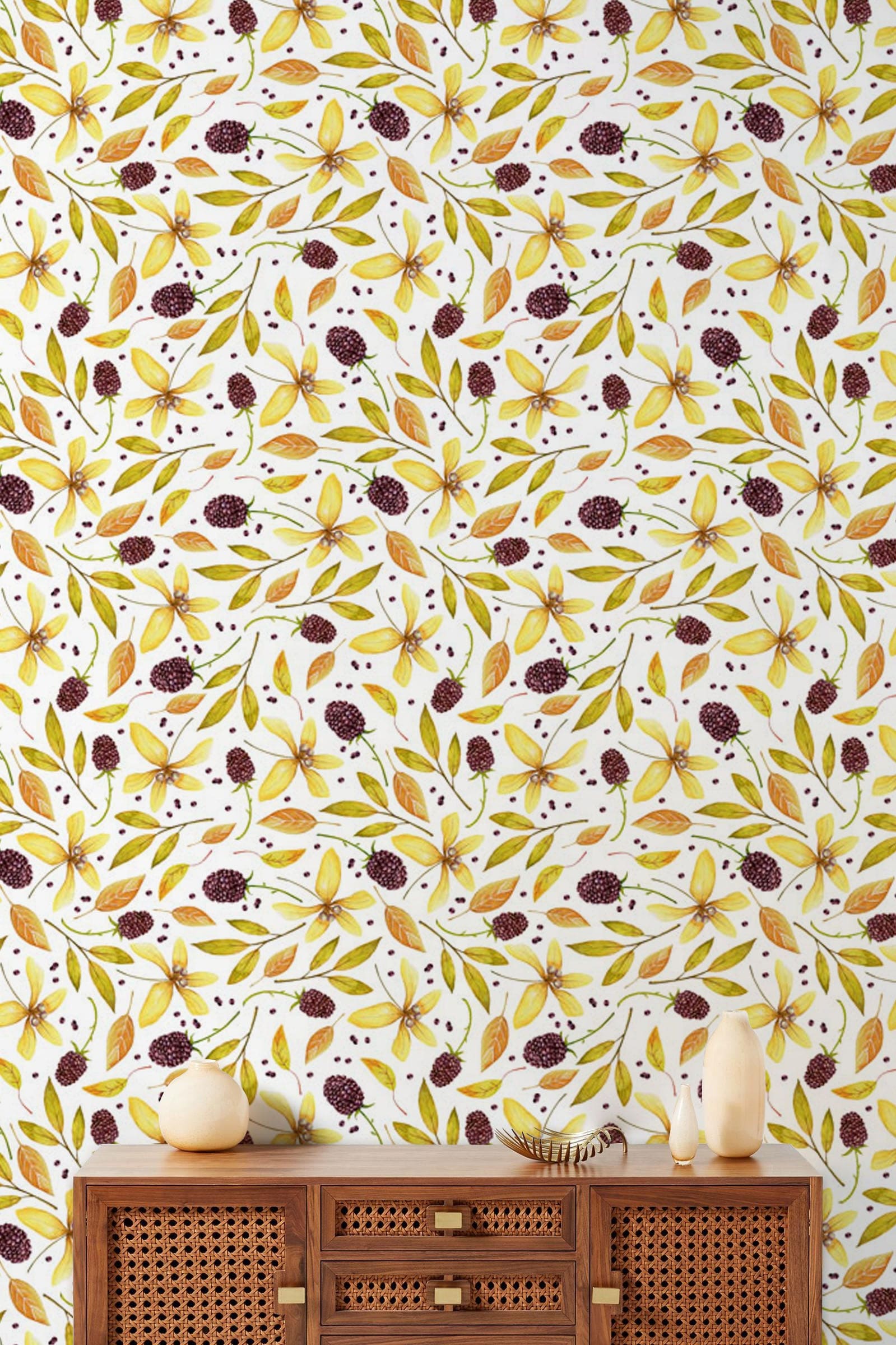 Créez un espace magnifique avec notre peint peint de feuille et de pin. Cette murale murale est conçue avec un motif répété de petite feuille d'automne et de pin dans un fond blanc, ce qui apportera un look vintage mais frais à votre espace. Fond mural parfait qui fonctionne bien avec toute votre chambre, salon, cuisine et salle à manger.