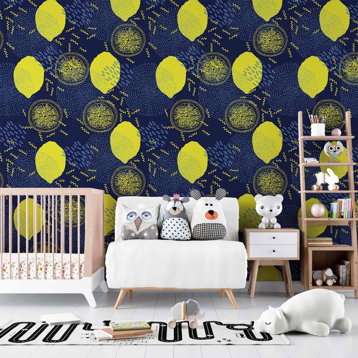 Rénover votre Kidsā €? Room Avec ce papier peint mural cool de citron et orange avec le Dark fond bleu qui rend le design très moderne et différent. Le design avec le jaune vif donnera un très beau thème dans la pièce et le rendra très moderne et chic. Style ce Ever Wallpaper avec des rideaux en mousseline blanc pour une vibrose très fluide à l'endroit.