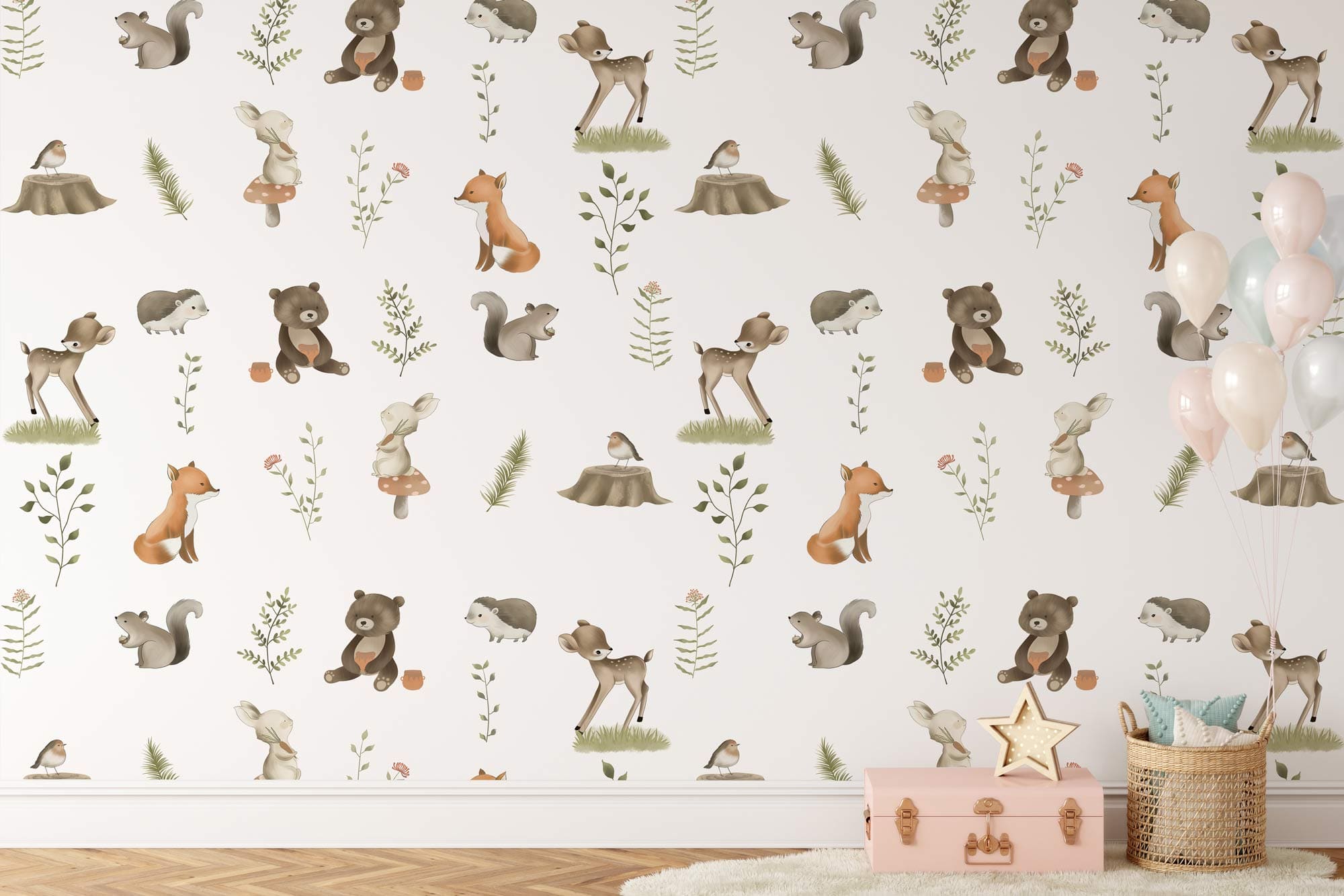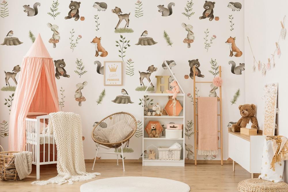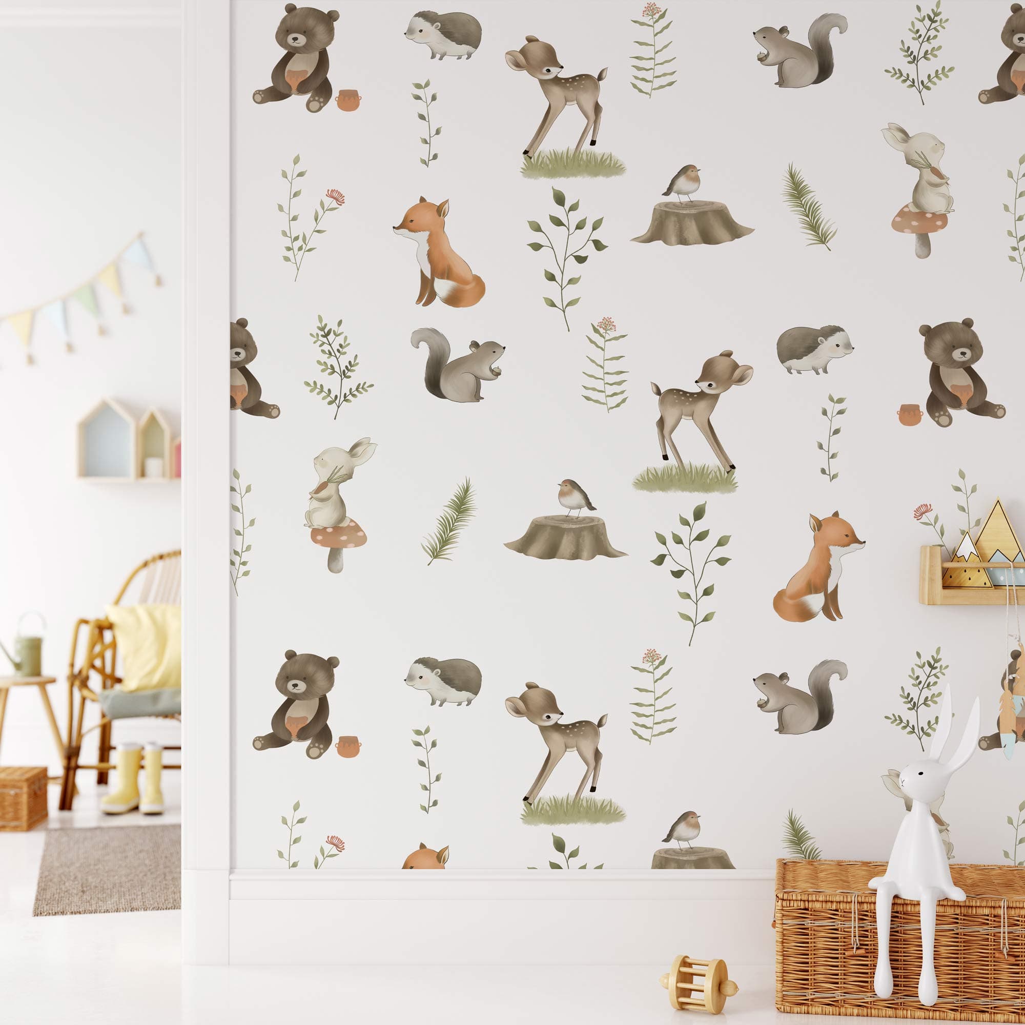 orner la chambre de votre enfant avec nos jolis petits animaux peint mural. Cette conception de motifs répétées comprend un joli renard, un écureuil et un ours sous un fond blanc qui ne fera pas fondre le cœur de vos enfants. Parfait pour une bébé pépinière ou la chambre de votre enfant et fonctionne mieux avec toutes sortes de styles de meubles.