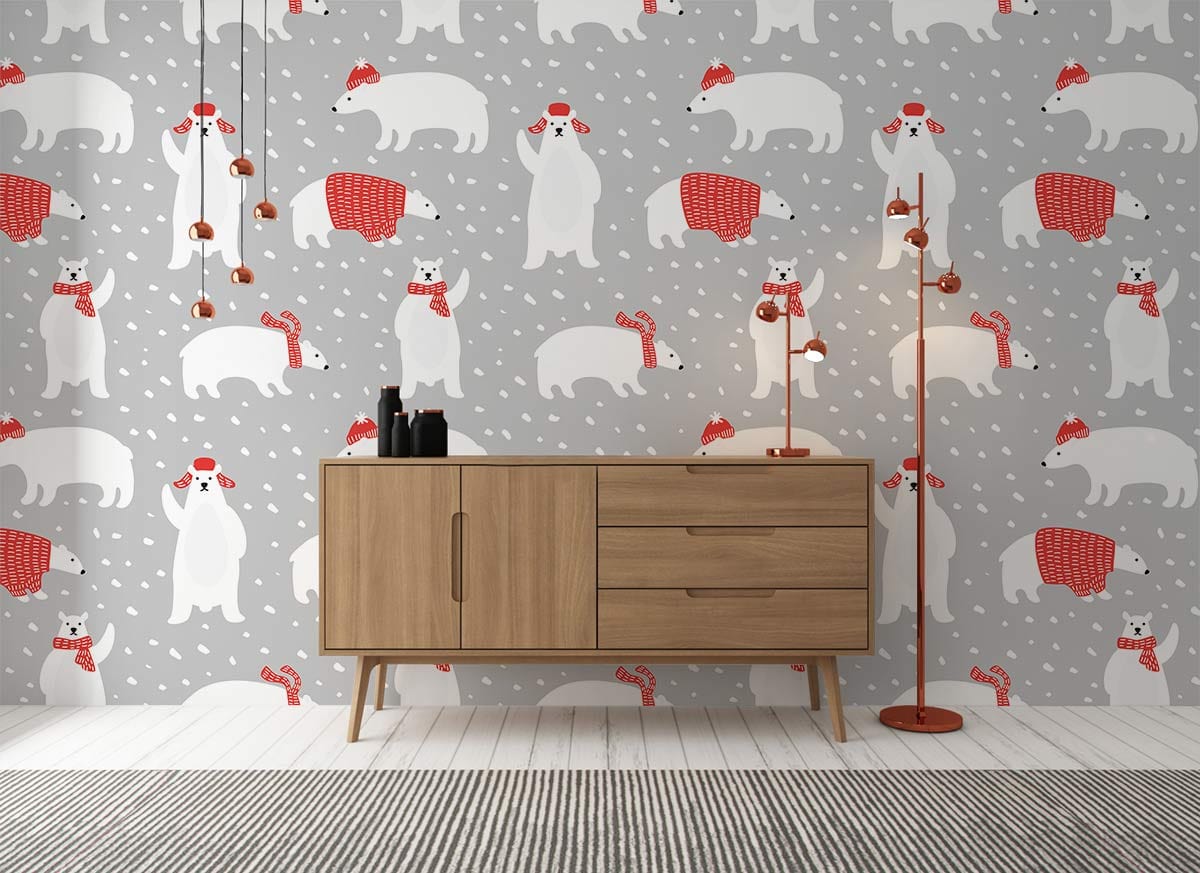 Ressentez les vibrations d'hiver avec M. Polar Bea R, l'un de nos conceptions de papier peint mignon mural qui rendront également votre place pleine de vibrations hivernales et d'esprit charismatique. C'est l'une de ces peintures murales que vous pouvez l'utiliser toute l'année ou si vous souhaitez rénover votre place, c'est parfait pour la saison d'hiver pour décorer votre salon, aire de jeux de vos enfants.Pour des photos plus amusantes et plus belles. L'arrière gris et les ours jouant et portant du rouge, font un choix parfait pour les filles et les garçons afin que cela puisse être l'option Joker tout en choisissant une belle murale qui conviendra à tout le monde. Le design est simple plein de motif d'ours qui est si simple et qui correspond aux enfants et aux adultes. Essayez d'utiliser une couleur sombre dans les décorations si gris foncé ou noir sera si bon pour le contraste du lieu