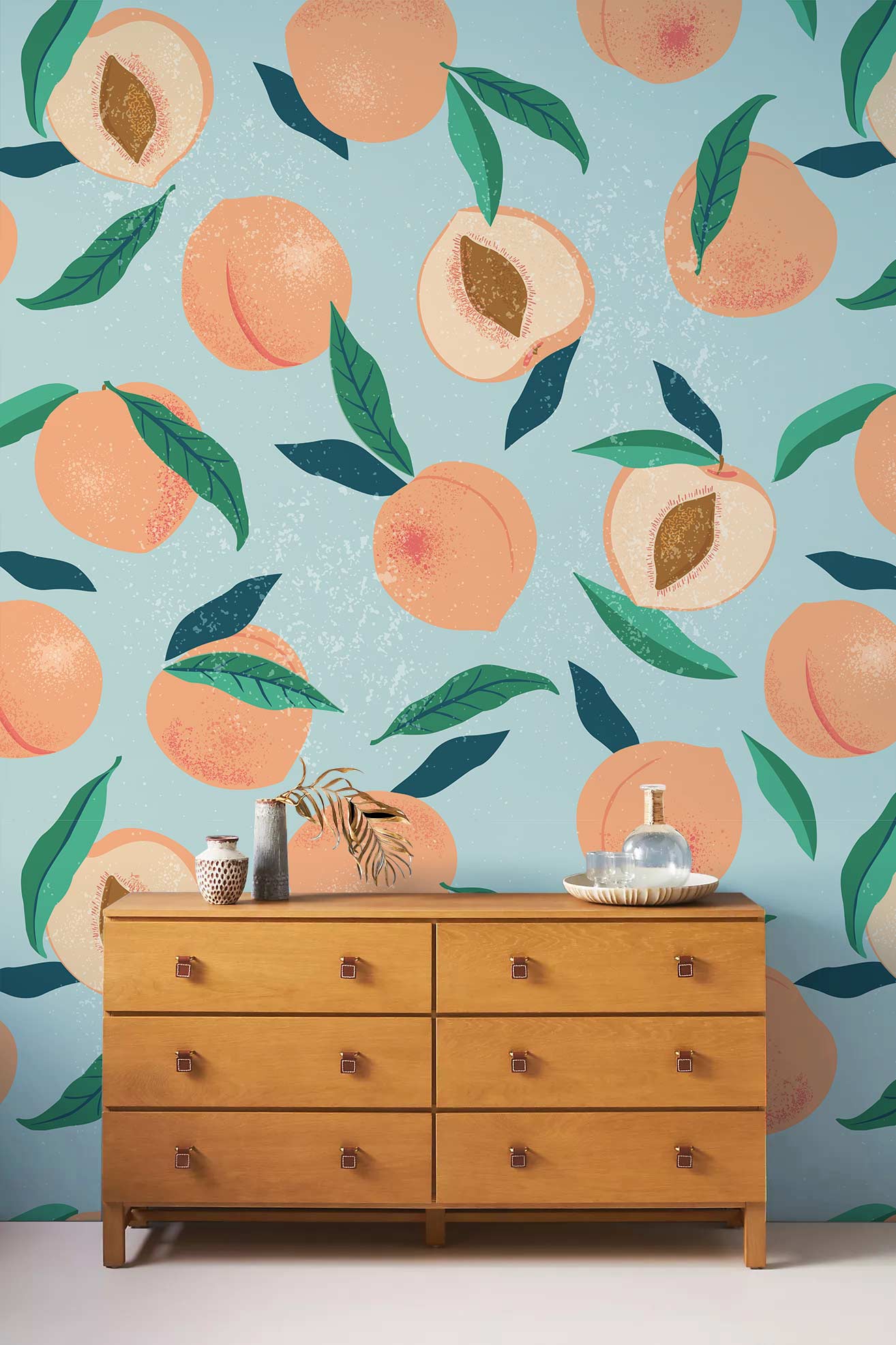 Donnez à votre espace un nouveau goût de couleurs et de modernité qui sera juste entre vos mains avec l'un de nos designs accrocheurs pour le papier peint mural de pêches tranchées et de fruits entiers. Le design semble si frais et nouveau, la palette de couleurs est si différente qu'elle capte l'attention. Le mélange de la couleur pêche avec le bleu aqua et les différentes nuances de bleu est tout simplement relaxant pour les yeux. Pour un look sauvage et attrayant, utilisez ce motif mural dans votre salon pour un design chaleureux et fort. Ceux qui aiment les couleurs inhabituelles sont toujours uniques et puissants. Essayez donc d'utiliser des couleurs neutres et unies pour ce design afin de vous concentrer sur la beauté du design et l'organisation de l'endroit.