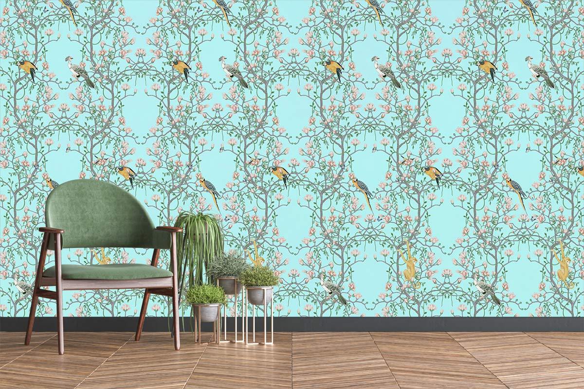 Ajoutez une touche de paradis à votre place avec ce papier peint mural brillant de la branche de la conception de la vie. Le design rendra votre place si spéciale et unique. Les nuances d'Aqua Blue en arrière-plan font un contraste très accrocheur avec les motifs et les perroquets concevant le papier peint mural. Une murale très élégante et chic pour ajouter un sentiment de modernité et d'élégance à votre . La conception a des nuances de palette très lite pour rendre votre place plus large et plus brillante avec une énergie stimulée partout. Ajouter les rideaux en mousseline et le mobilier en bois blanc cassé pour un mode très relaxant dans la pièce et pour des vibrations plus fluides.