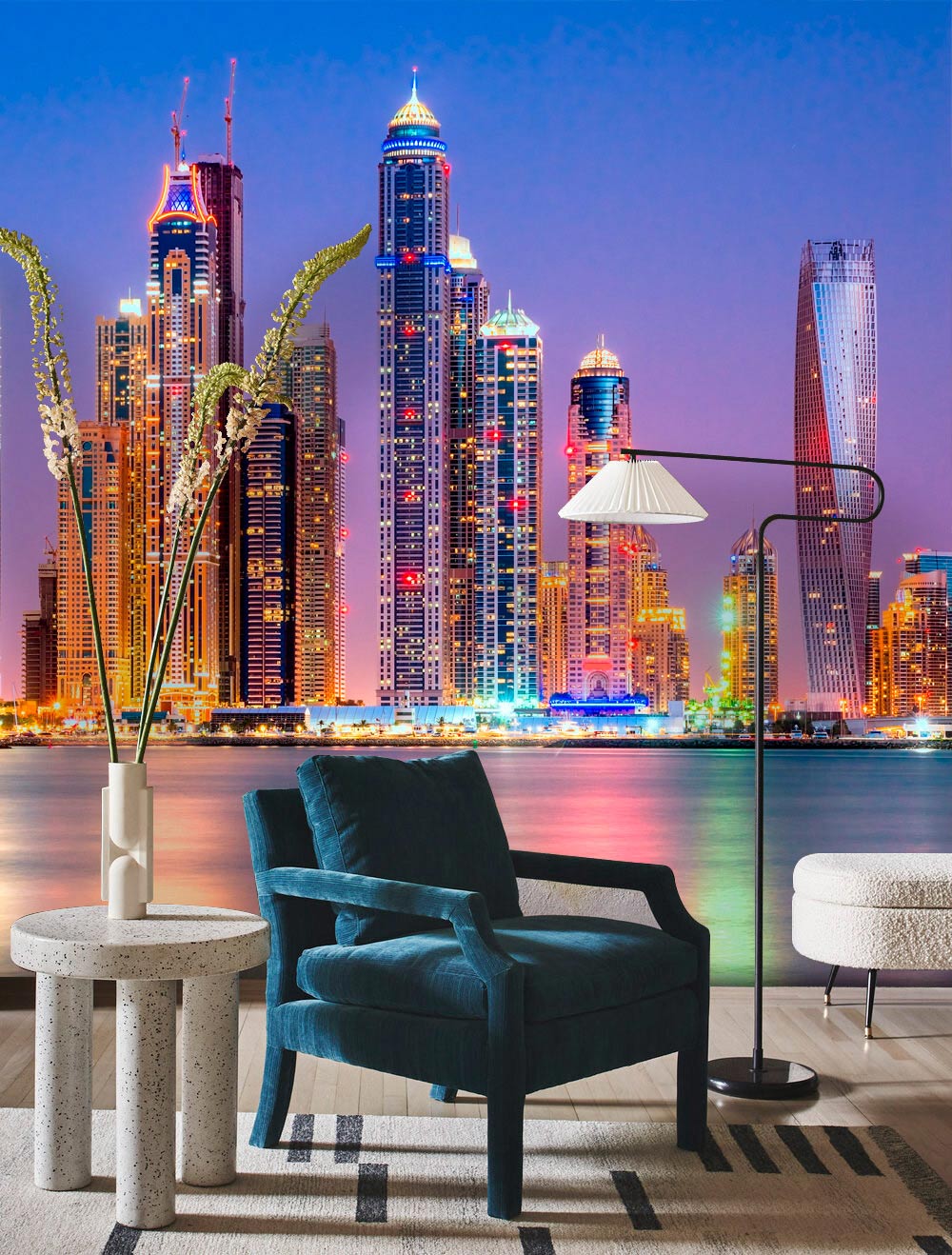 Démarquez-vous du reste avec ce superbe papier peint mural néon de Dubaï. Avec une vue fascinante de Dubaï et les lumières colorées de ses célèbres bâtiments et tours, ce magnifique papier peint mural sera un accent idéal pour vos murs tout en fournissant un point focal saisissant à votre maison. Imprimé sur des matériaux de haute qualité et respectueux de l'environnement, c'est le moyen idéal de créer un look inoubliable. Ce design est le meilleur choix pour une décoration intérieure moderne et un excellent moyen d'apporter un peu de chaleur et de charme dans votre pièce.