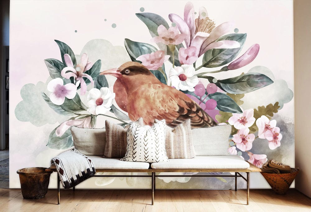 Appréciez la beauté naturaliste de notre papier peint mural Oiseau en fleur. Cette peinture murale représente un oiseau brun perché au milieu de fleurs violettes et blanches, créant un look discret mais charmant pour vos murs. Ce motif est idéal pour égayer votre salon, votre chambre à coucher ou tout autre espace de votre maison, tout en affichant un aspect vintage intéressant, peint à la main, qui convient parfaitement aux intérieurs à thème floral et aux meubles en verre délicats.
