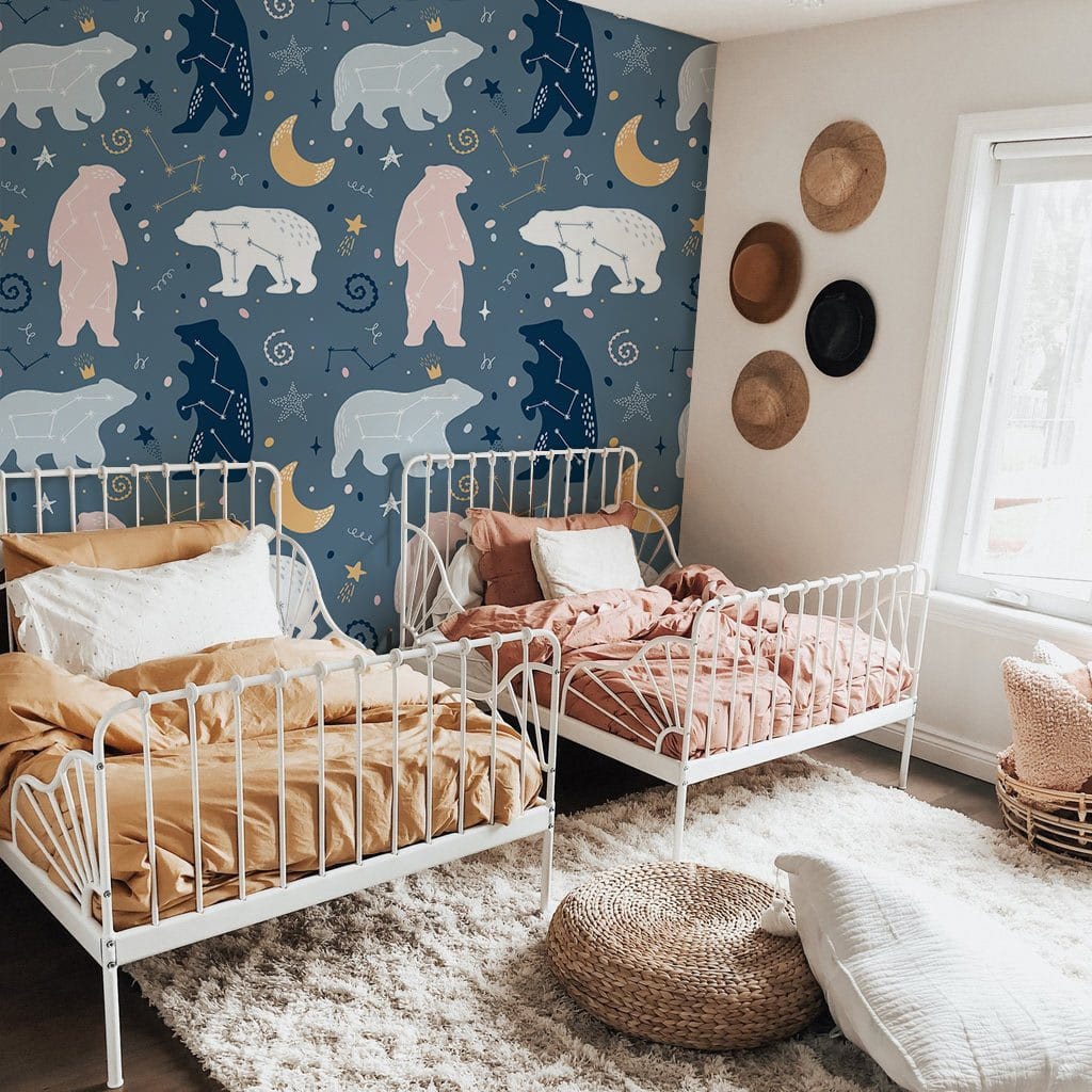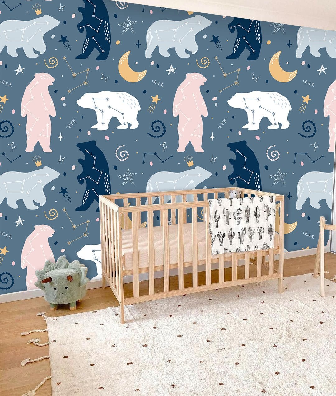Apportez une belle ambiance à votre espace avec ce papier peint mural ours polaire accrocheur. La conception crée diverses silhouettes d'ours polaires de dessins animés mignons avec une constellation sur leur corps, ce qui impressionnera tous ceux qui la verront. Utilisez-le comme mur caractéristique dans votre chambre ou chambre d'enfant et associez-le à des meubles de couleur blanche ou pastel de votre choix.