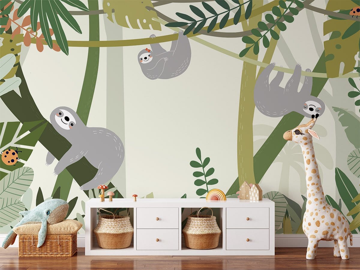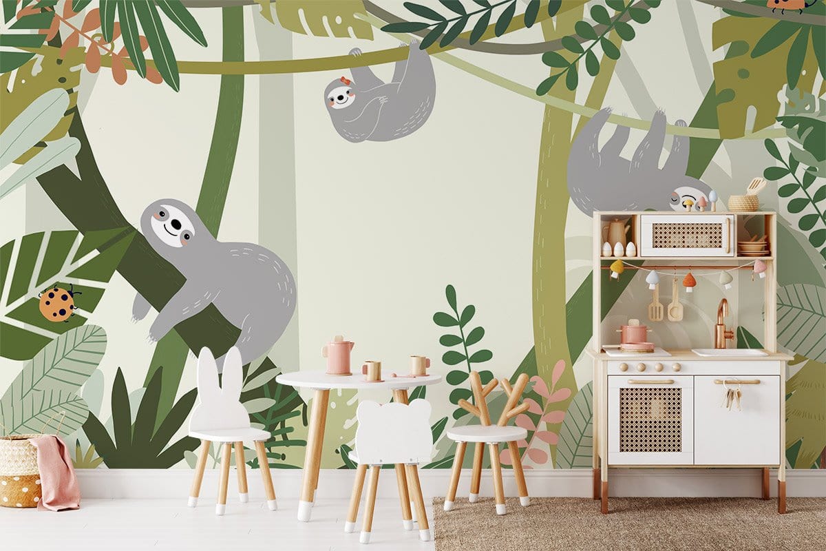 Cette peinture murale paresseuse illustrée ludique donne vie à vos petits si vous voulez trouver un papier peint animal effronté pour la chambre de la chambre ou la pépinière de votre enfant. Avec une toile de fond de la forêt tropicale fraîche et des paresseux ludiques se balançant au-dessus, les enfants adoreront passer du temps avec leurs nouveaux amis mignons et à fourrure. Choix de papier peint parfait pour la chambre et la salle de jeux de votre enfant.