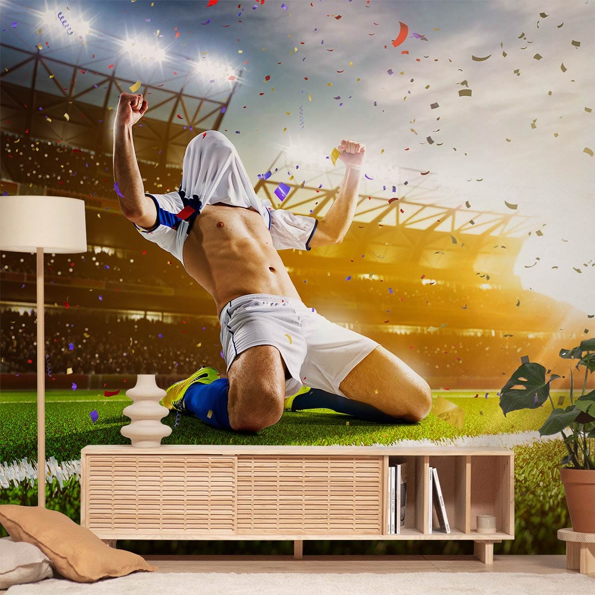 Célébrez une victoire au football avec notre papier peint mural Soccer Play Victory, qui met en scène un joueur de football à genoux pour montrer le succès de son équipe. Cette peinture murale est un excellent moyen d'ajouter une touche de couleur et de caractère à votre pièce. Que ce soit dans votre cave à hommes, votre chambre d'enfant ou même dans le vestiaire de votre équipe sportive préférée, ce papier peint est une façon de montrer votre amour du football et d'apporter un niveau supplémentaire d'excitation à n'importe quelle pièce.