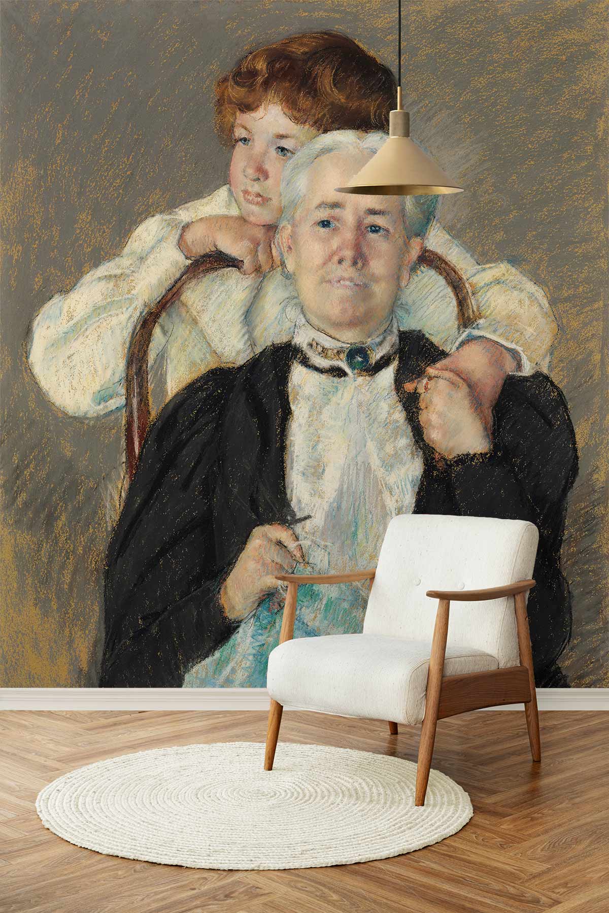 Ajoutez une œuvre d'art qui représente l'aristocratie, la noblesse et l'authenticité à votre maison avec ce papier peint panoramique. Ce design qui combine deux générations différentes vous donnera l'impression de regarder une posture pleine d'amour et de gentillesse qui appartient à une époque très lointaine. Ce papier peint qui contient la noblesse et l'authenticité de Cyrus Lawrence assis et de son petit-fils lui tenant la main et étreignant le dossier de sa chaise avec l'innocence enfantine. Ce papier peint panoramique est parfait lorsque vous souhaitez ajouter de l'élégance à des vibrations chaleureuses. Un design qui impressionnera tous vos invités et fera ressortir l'authenticité de votre lieu.