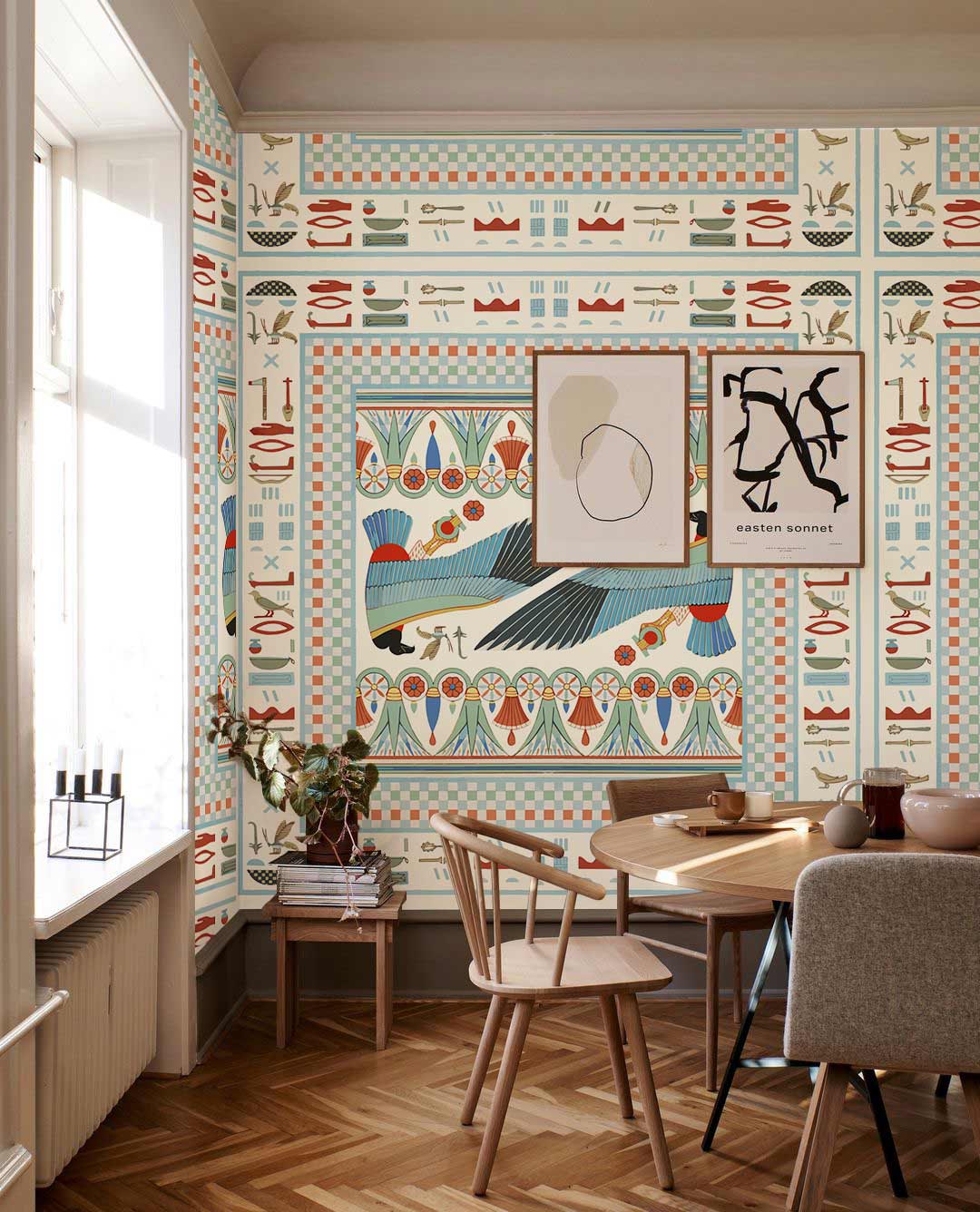 Ce papier peint panoramique, égoïste et symboles égyptiens, vous transportera dans un pays merveilleux avec la culture égyptienne. Les motifs délicats et la combinaison subtile de belles couleurs feront de votre pièce un endroit fascinant. Ce sera un bon choix d'installer ce papier peint mural dans votre chambre à coucher, votre salle à manger, votre couloir et votre cuisine. Vos invités seront étonnamment surpris par cette merveilleuse décoration.