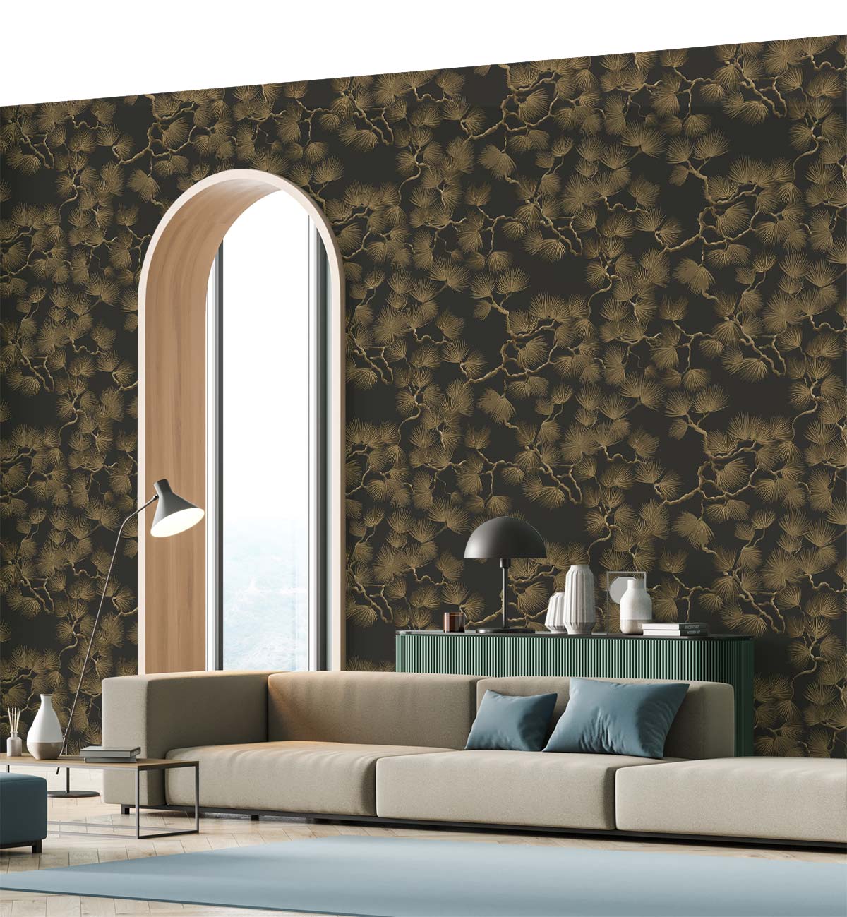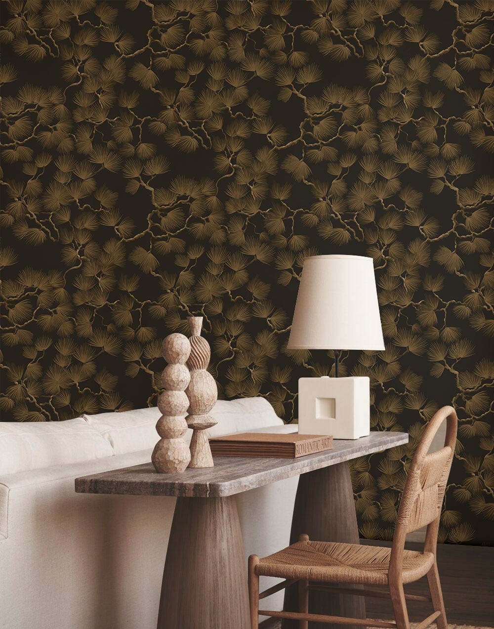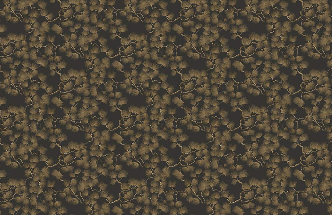 Un luxueux morceau de fleurs en pin, avec fond noir et fleurs en pin doré pour une ambiance plus riche et plus authentique chez vous. Les vieilles civilisations ont utilisé les pins comme symbole de l'authenticité et de la majesté, c'est l'une des graines les plus chères du monde et il a un goût spécial qui est utilisé pour les traitements et sur des recettes spéciales pour la nourriture. Ce modèle répété simple de branches de pin est une signification pour la simplicité et la base. C'est un design pour des lieux authentiques, des conceptions de palais et des décorations vintage. C'est aussi un choix de Joker pour les décorations modernes de base car elle fonctionne parfaitement avec les deux. Le design est tellement parfait pour être stylisé avec plusieurs design et des couleurs, vous ne serez donc pas hésité avec ce que vous allez le coiffer car il s'adaptera à diverses options dans votre chambre, votre ou même à votre bureau.