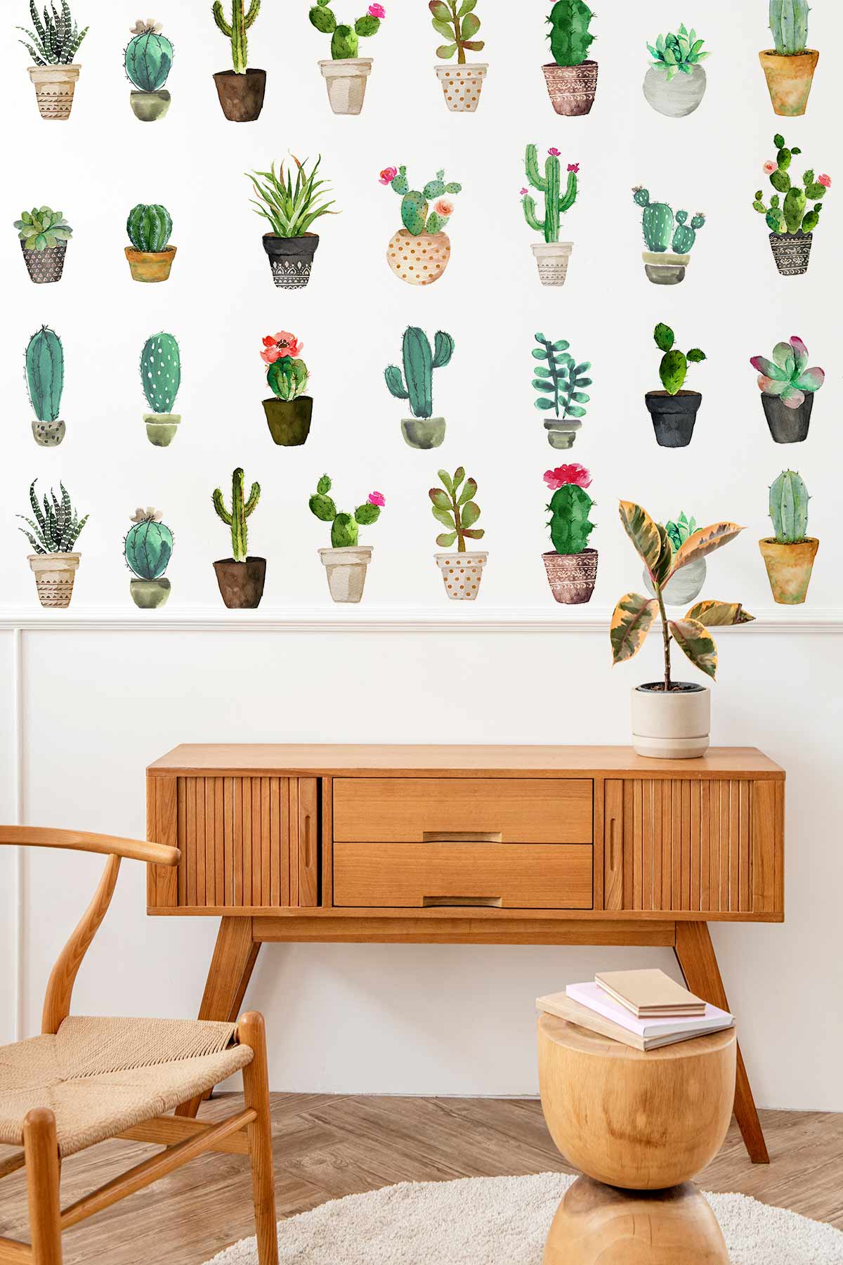 Boostez l'énergie de votre lieu en vous inspirant de la beauté de la nature en vert. Ce papier peint mural représentant un pot de fleurs en forme de cactus donnera à votre maison un aspect vivant et plein de vie, et très relaxant. Ce papier peint mural s'adapte parfaitement à votre chambre à coucher pour des vibrations plus positives avec des décorations modernes. Si vous ouvrez bientôt votre magasin de fleurs et que vous recherchez un style très attrayant qui attire vos clients impressionnés par l'endroit et qui ne peuvent résister à vos produits. Créez cette peinture murale dans la chambre de vos enfants pour améliorer leurs connaissances et leur donner des informations sur les types de cactus dans le papier peint mural.