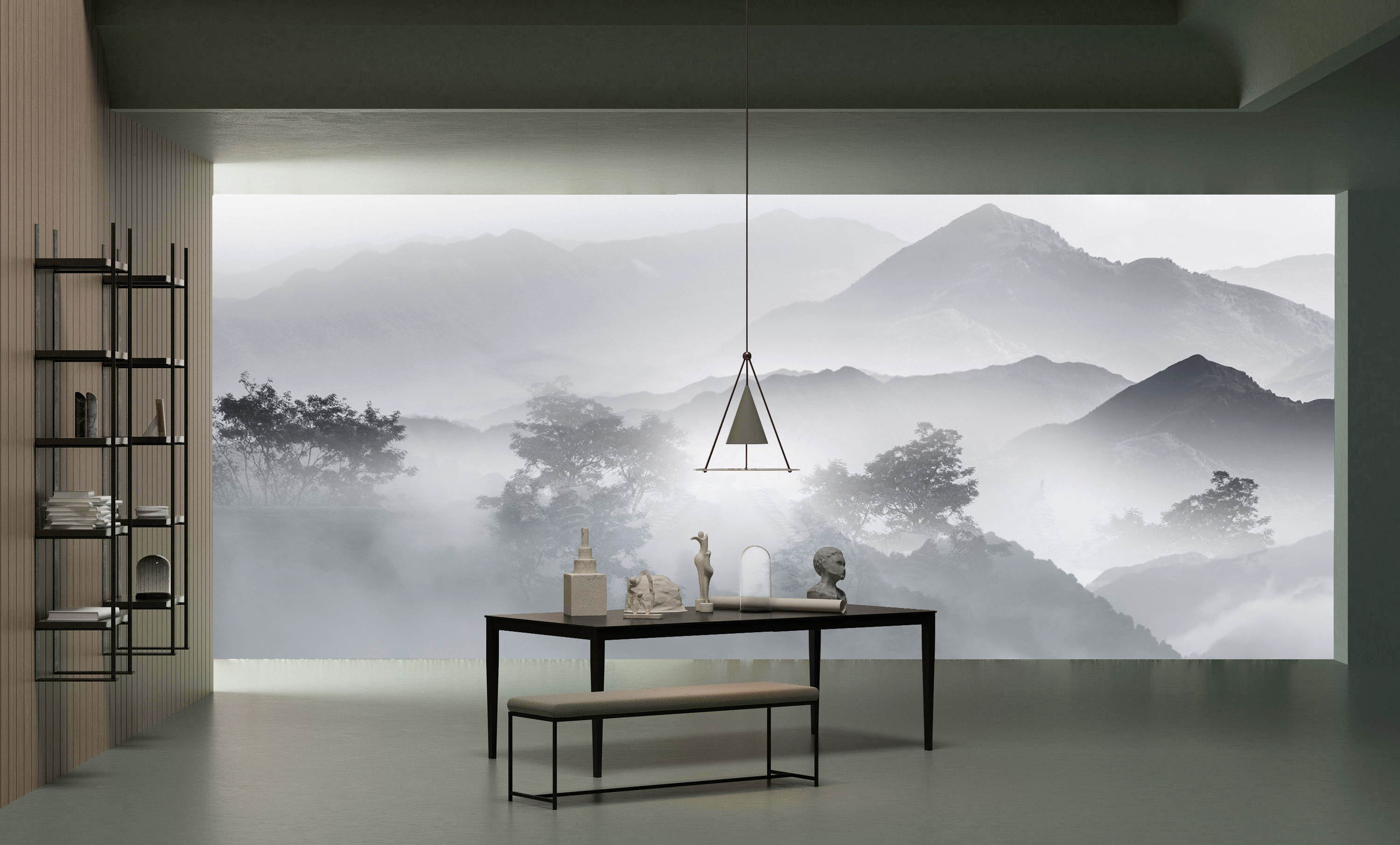 Regardez à travers la cime des arbres avec le papier peint magnifiquement brumeux de la forêt nuageuse, montrant une forêt dense située à l'intérieur d'une vallée brumeuse. Les douces crèmes neutres des nuages et les silhouettes grises des arbres rendent ce papier peint parfait pour la plupart des combinaisons de couleurs. Pourquoi ne pas le placer dans votre chambre, salle de bain, salle à manger et couloir pour ajouter une touche paisible et aérée à votre espace.
