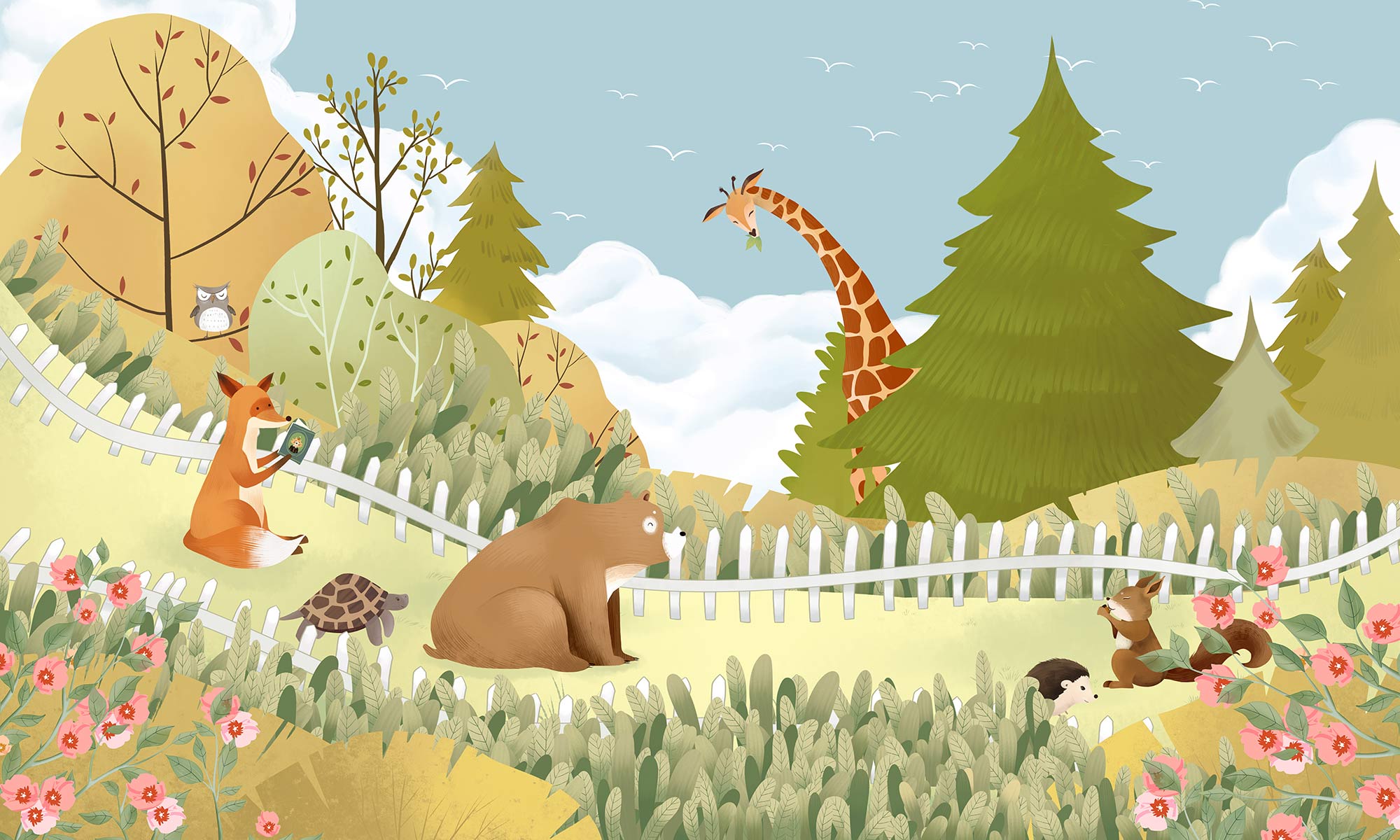 Vos enfants vont adorer ce papier peint animé de fête sur la pelouse. Plein d'animaux sauvages mignons comme le renard, l'ours, la girafe, le lapin ayant une merveilleuse fête dans la forêt. Cette peinture adorable et attrayante fait fondre le cœur et sera parfaite pour la chambre et la salle de jeux de votre enfant. Rendu intéressant avec une ambiance naturelle et une décoration murale rafraîchissante parfaite pour vos enfants.