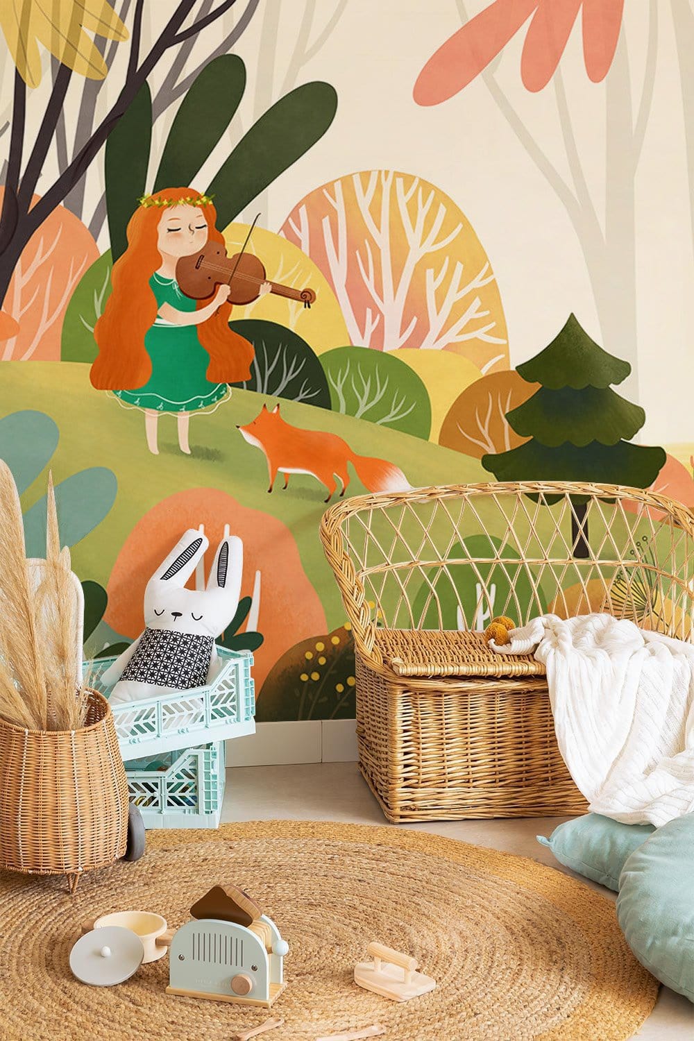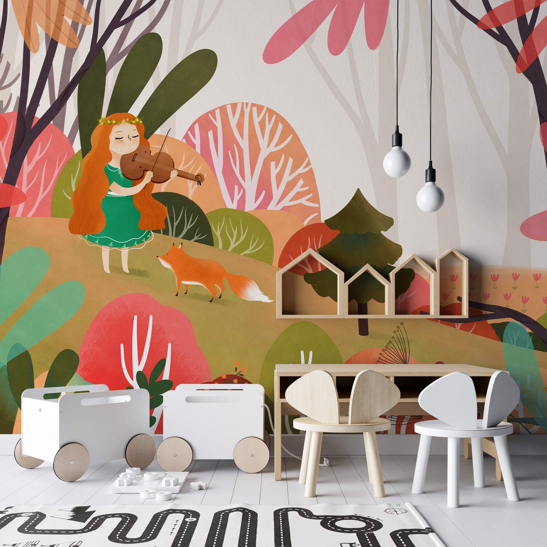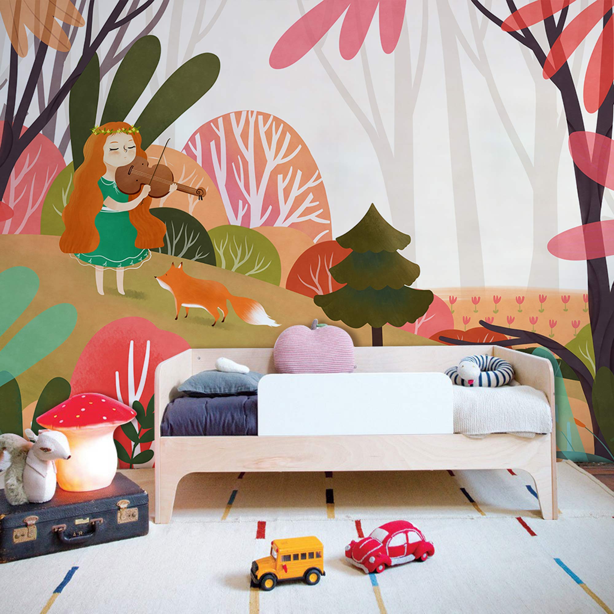 Avec l'aide de ce papier peint mural Musicien II, stimulez l'imagination de votre enfant ! Cette peinture murale musicale représente une petite fille de dessin animé tenant un violon dans ses mains sur un fond de couleurs vives. L'idée que la musique donne le ton à chaque endroit et qu'elle sera toujours motivante et optimiste est renforcée par le design enfantin, qui est décoré dans les teintes automnales joyeuses du rouge vif et du vert riche. L'image de l'animal renard ajoute également une touche créative à cette fantastique œuvre d'art.