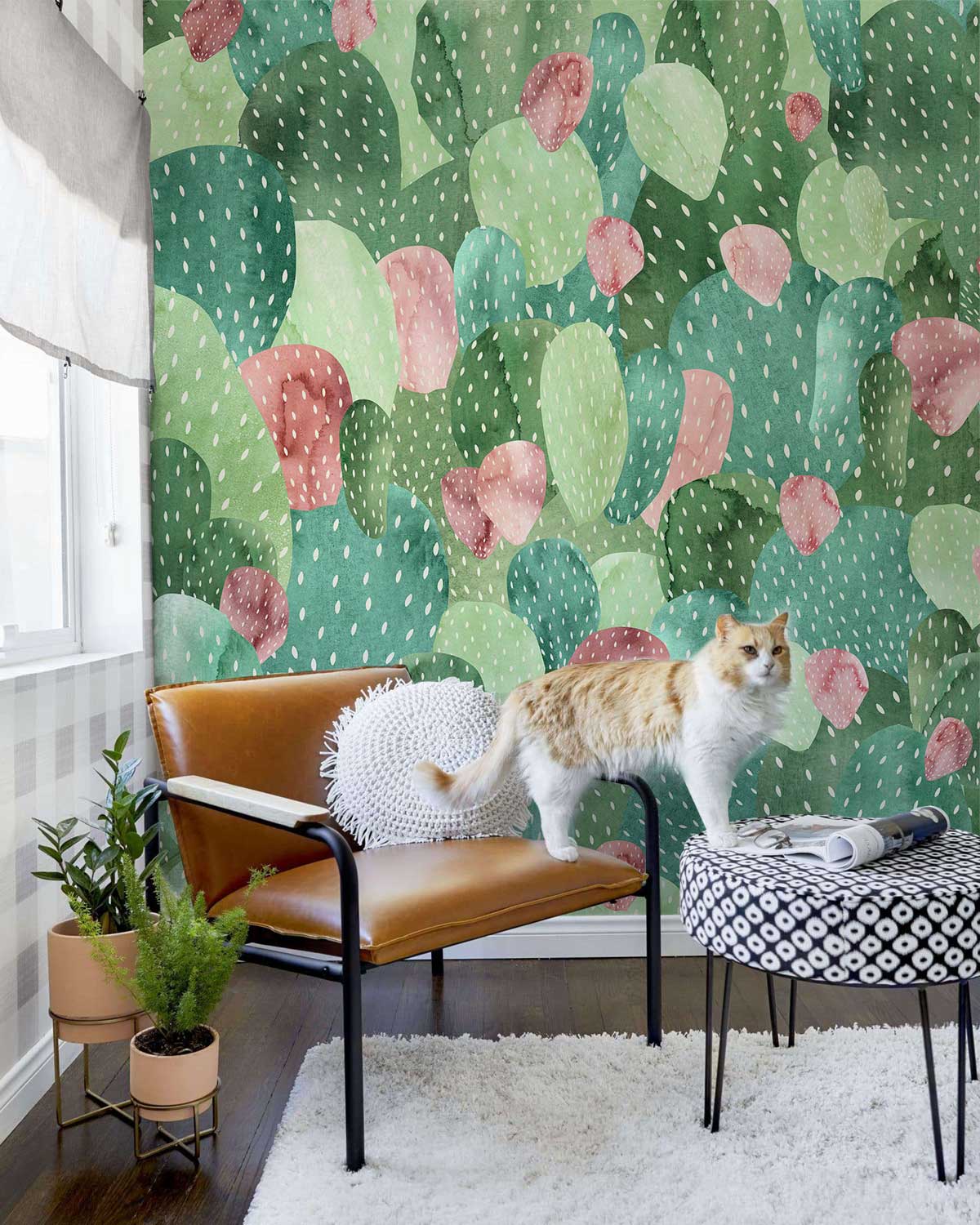 Si vous êtes de ceux qui savent se connecter avec la nature, et si vous appréciez vraiment la beauté de la nature dans tout ce que vous voyez. Vous serez certainement l'un de ceux qui voient la beauté du cactus malgré les épines qui recouvrent son corps. Parlez à la nature à travers l'un des papiers muraux les plus beaux et les plus modernes qui ajoutera un goût spécial à votre maison grâce aux couleurs vives et au mélange entre les nuances de vert et les nuances de violet. Cette peinture murale rendra votre chambre à coucher exceptionnelle et vous fera ressentir des vibrations positives chaque fois que vous entrerez dans votre chambre, n'oubliez pas de la styliser avec des décorations modernes simples et un lit blanc cassé pour plus de vibrations lumineuses.